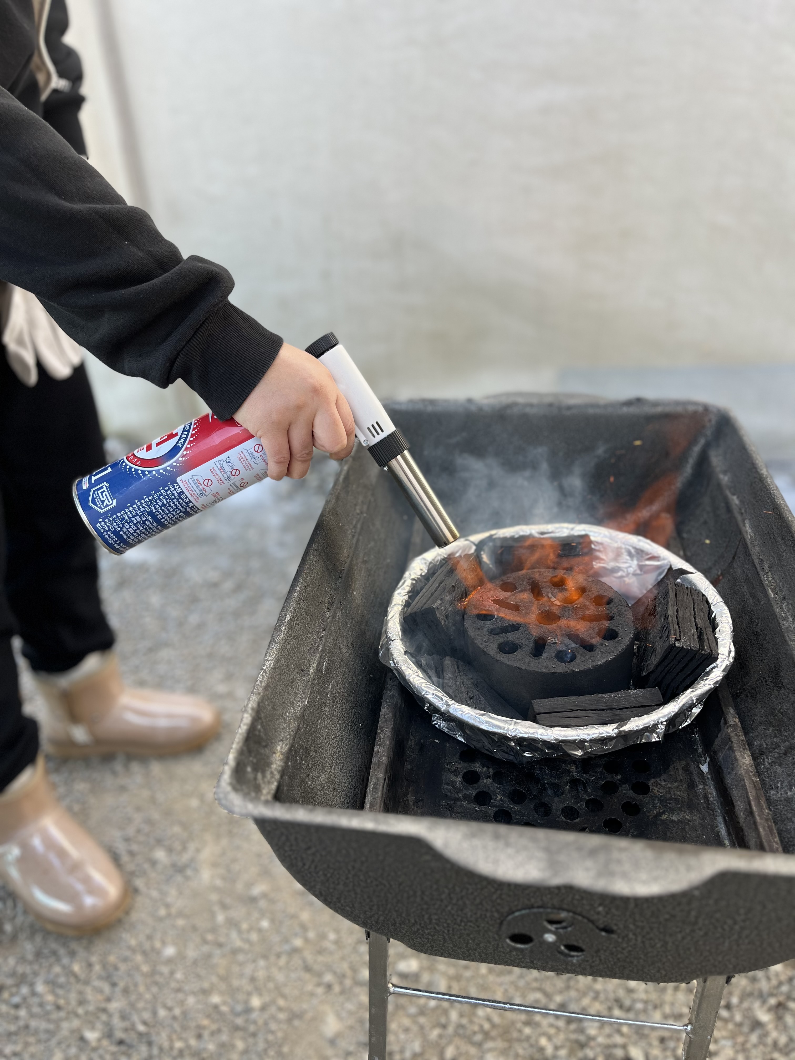 야외에 바비큐 할 수 있도록 번개탄과 숯을 준비해 주셨어요. 바비큐자리는 텐트의 왼쪽이 우리 껏이에요. 저는 착각을 해서 남의 집에서 바비큐 구울 뻔했지 머에요.^^:;; 토치로 번개탄에 먼저 불을 붙여 주면 되는 아주 간단한 작업이에요. 엄마들만 있다고 해서 당황하지 말고 도전~!