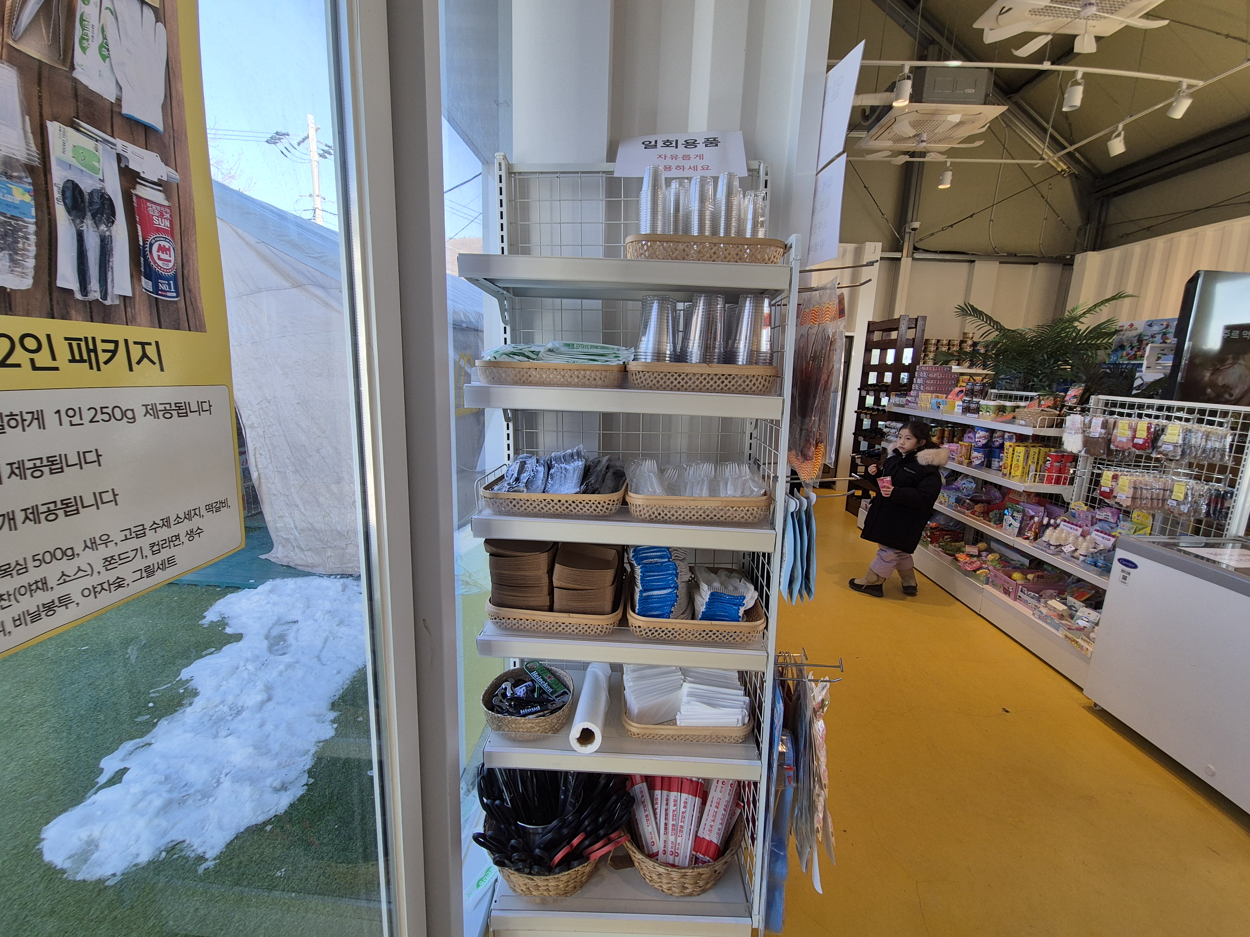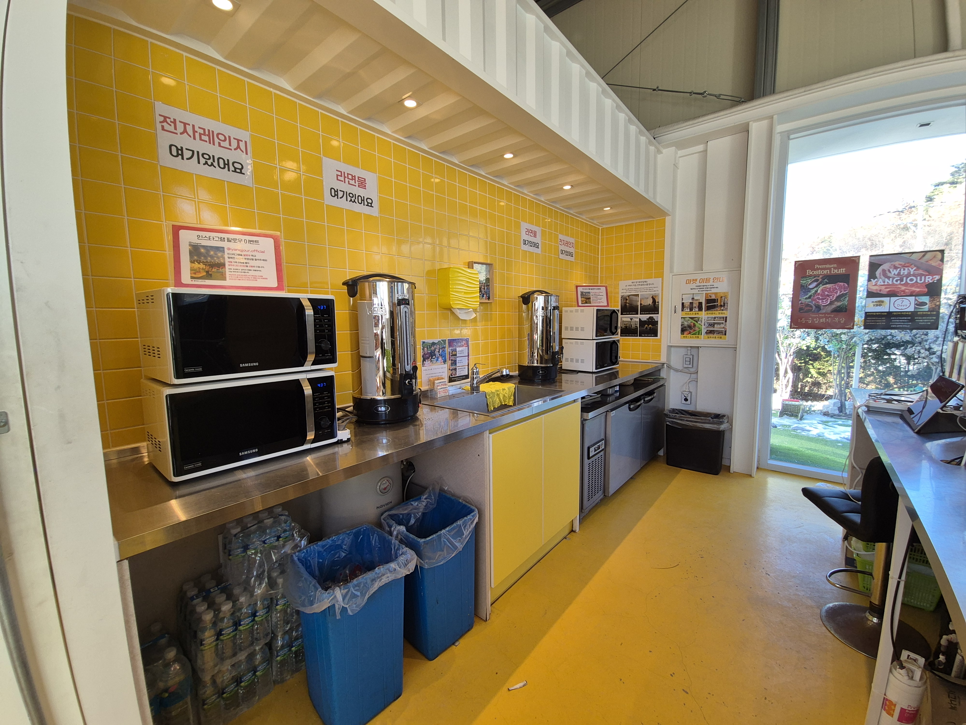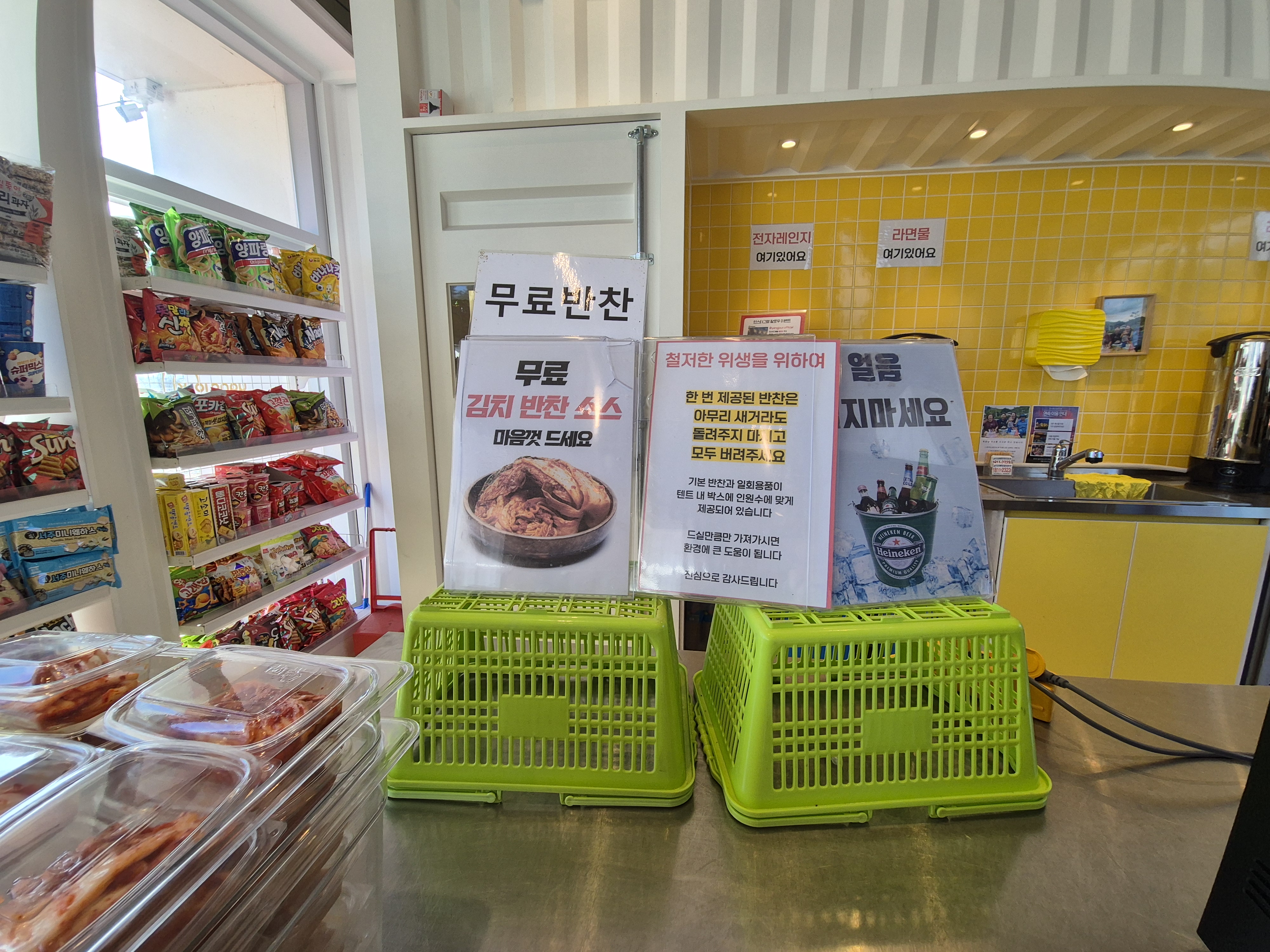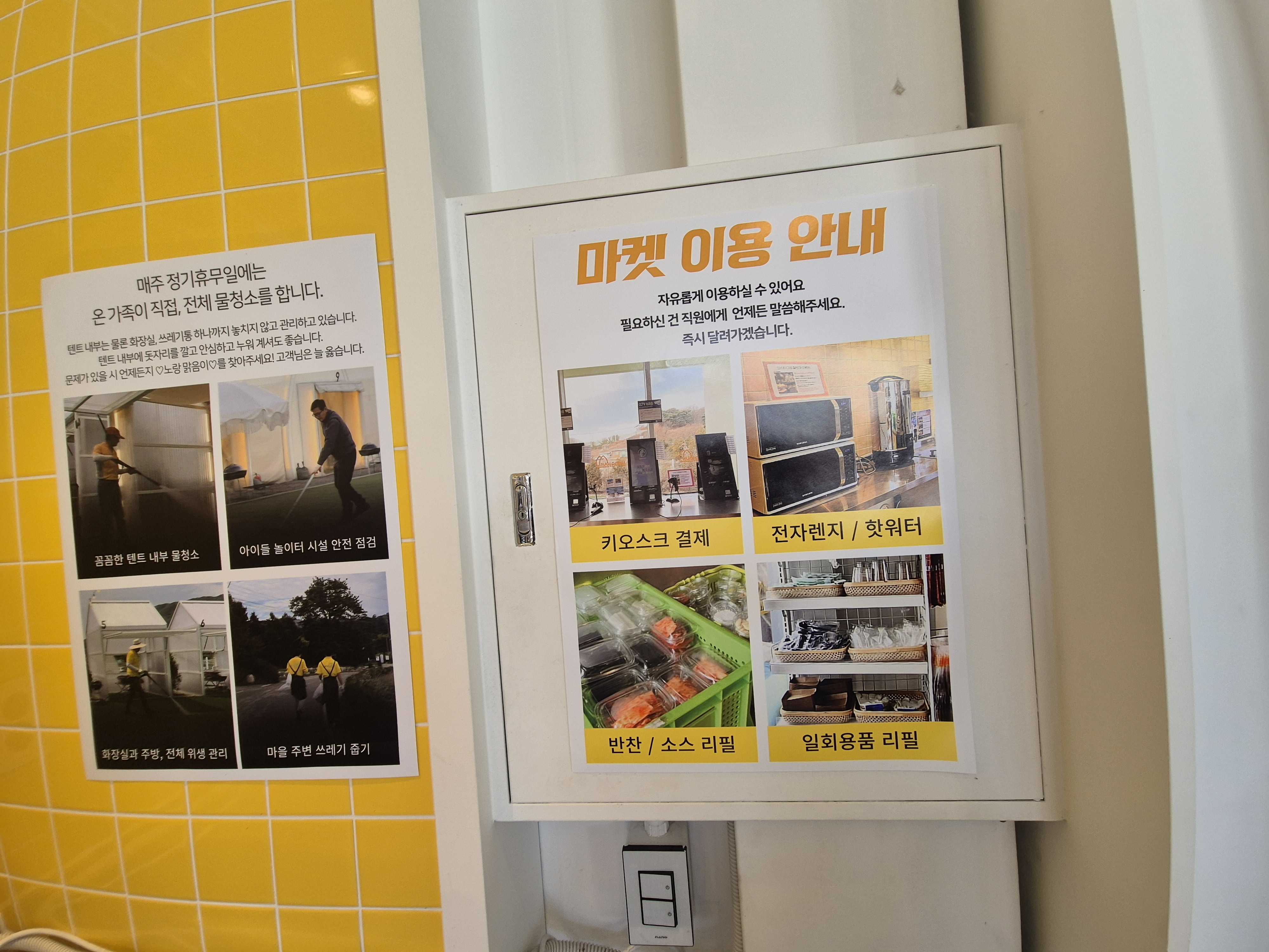 양주르는 마켓도 엄청 깨끗해요. 깔끔하죠~ 바비큐에 햇반이 없어요. 마켓에서 구입하고 전자레인지 돌려 가면 되고 여기에 밑반찬이 무한리필도 여기 있어서 초록바구니에 담아 가면 됩니다. 시스템이 참 깔끔하단 생각이 들더라고요. 마켓이 입구초입에 있다 보니 텐트와는 거리가 멀긴 해요 필요한 게 있으면 한 번에 움직이면 좋아요.