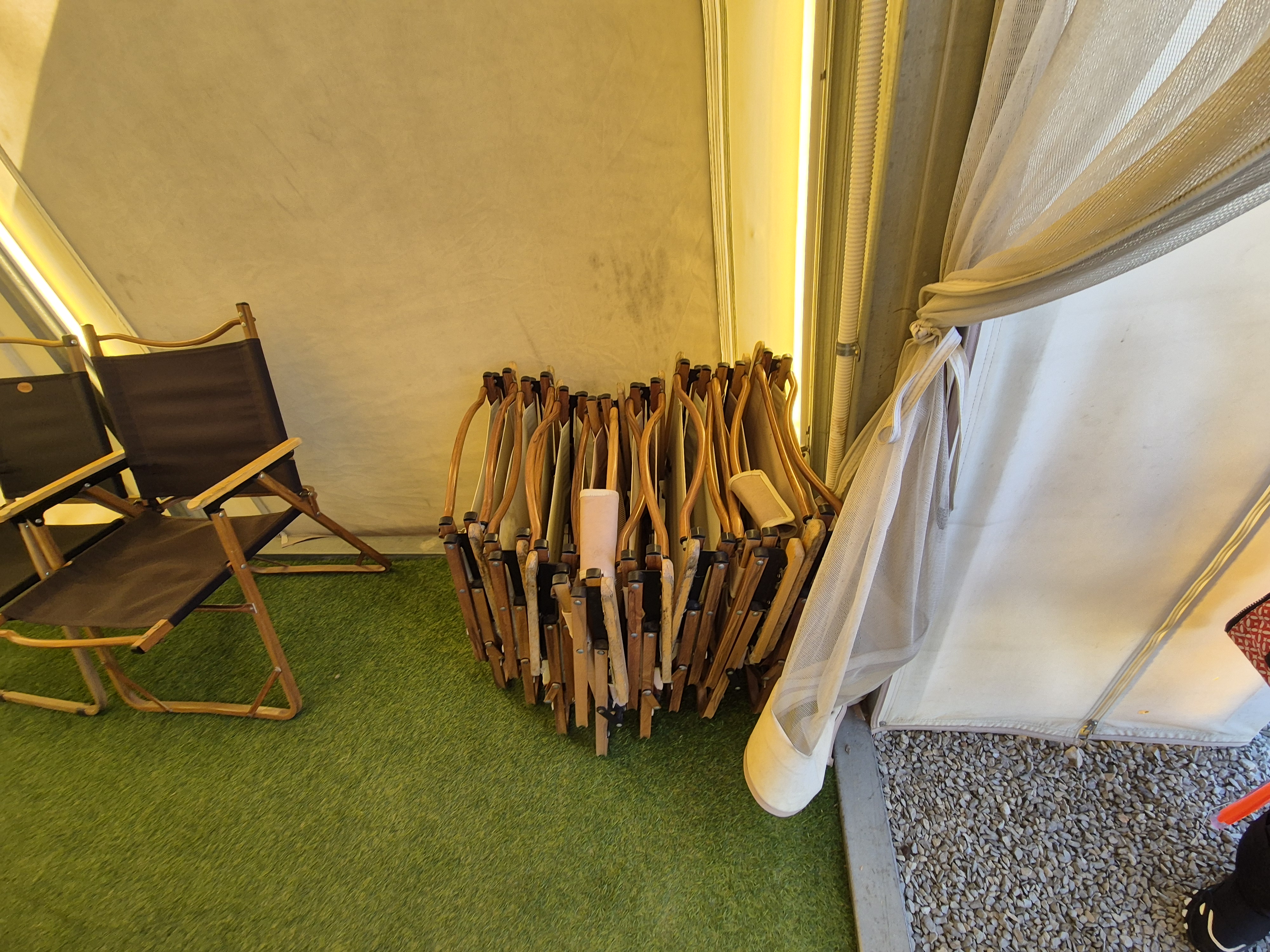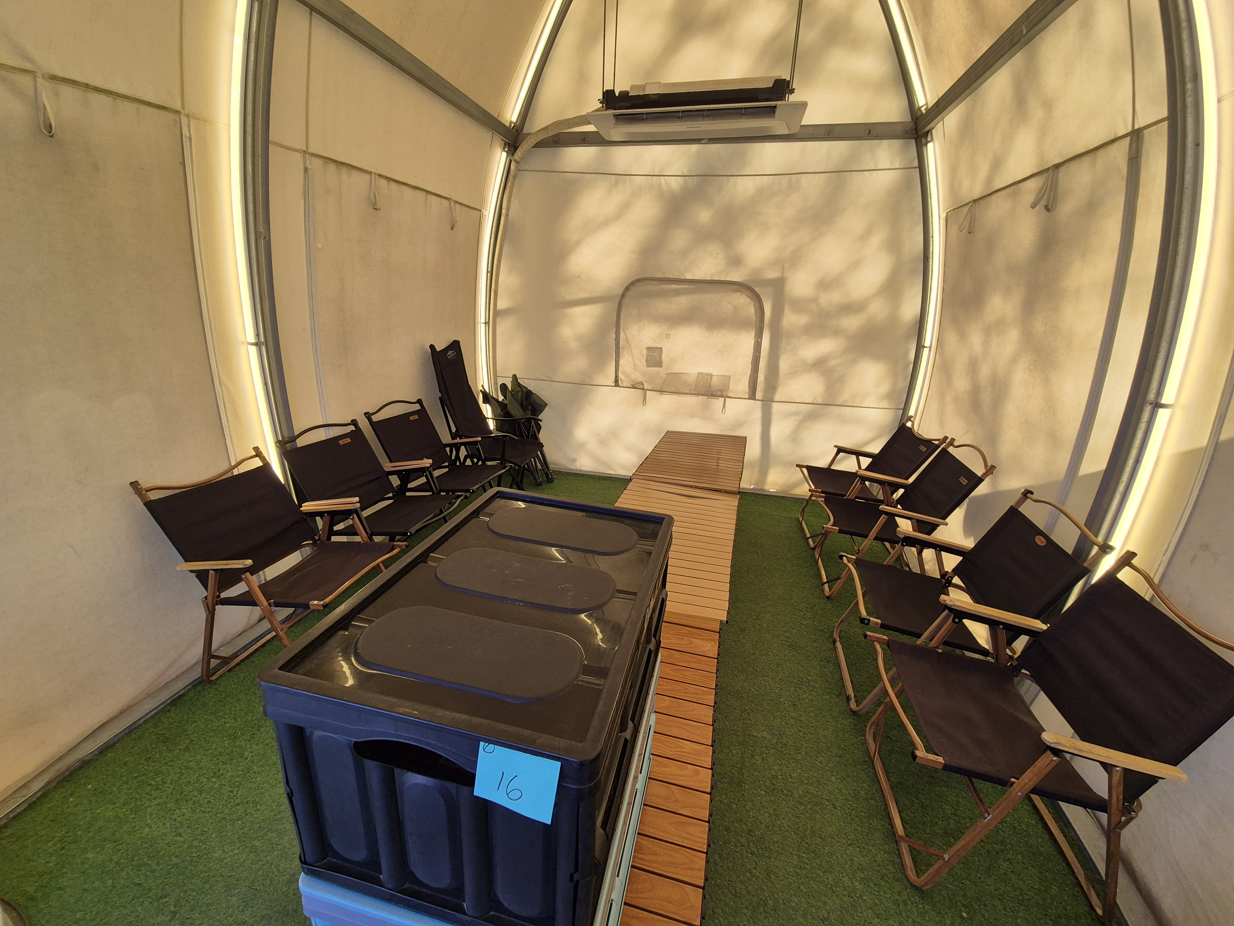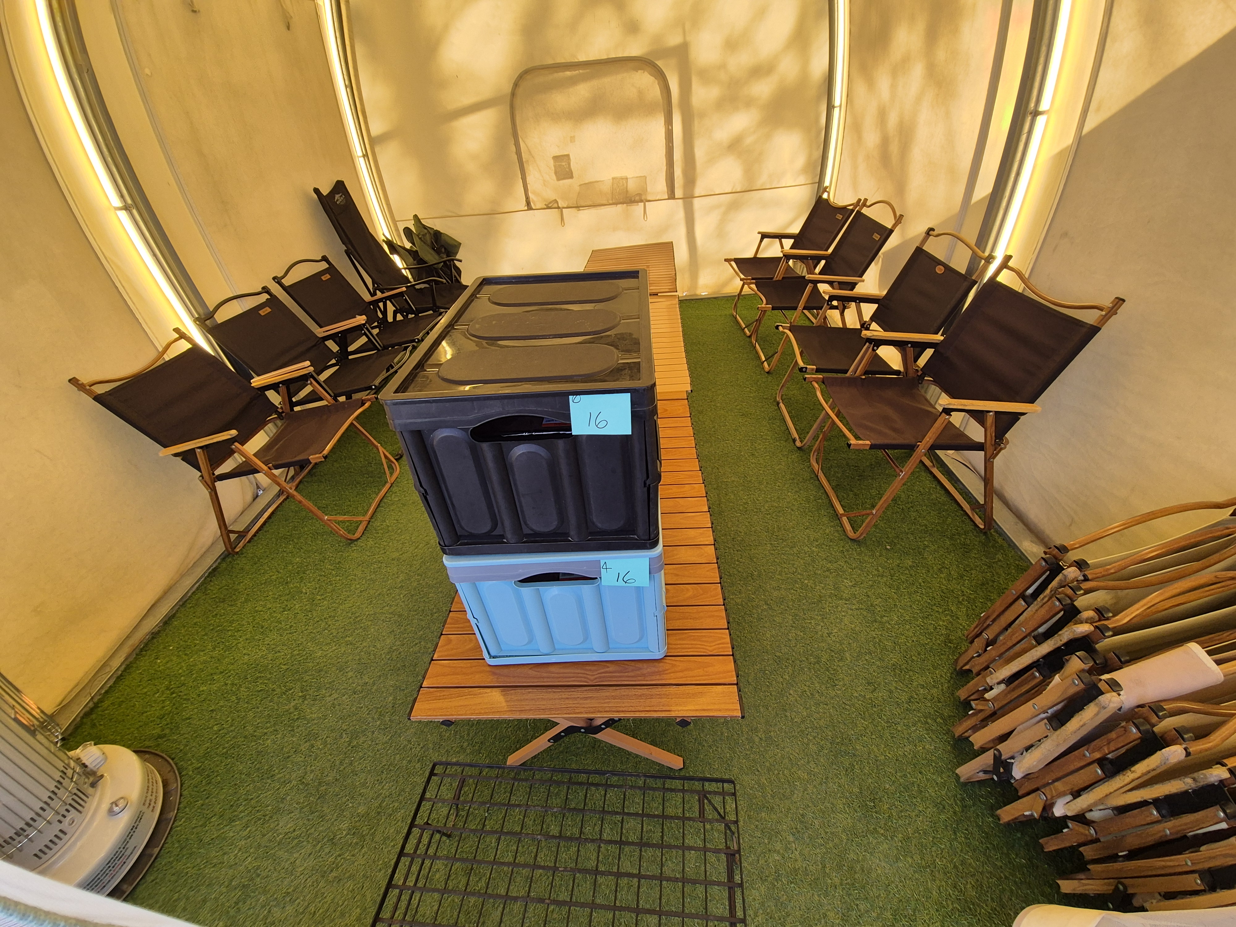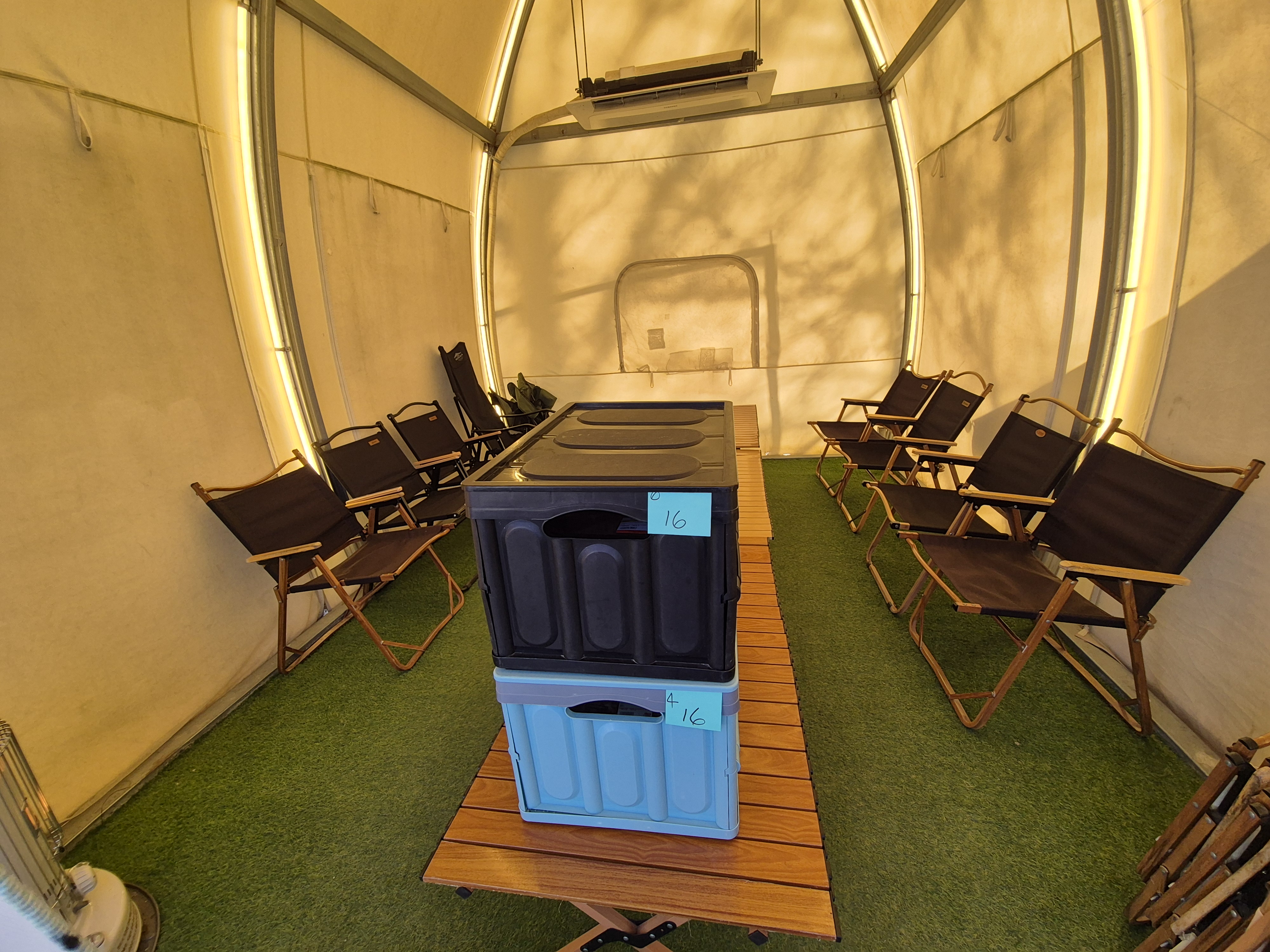 - 글램핑 텐트 안의 구성품 : 캠핑의자, 테이블, 에어컨, 히터, 난로