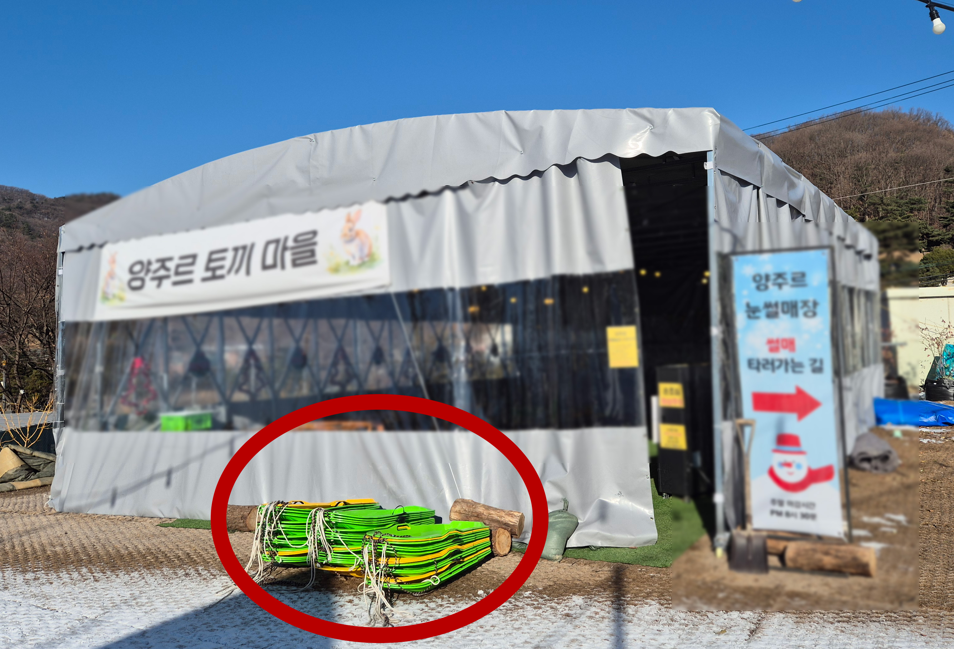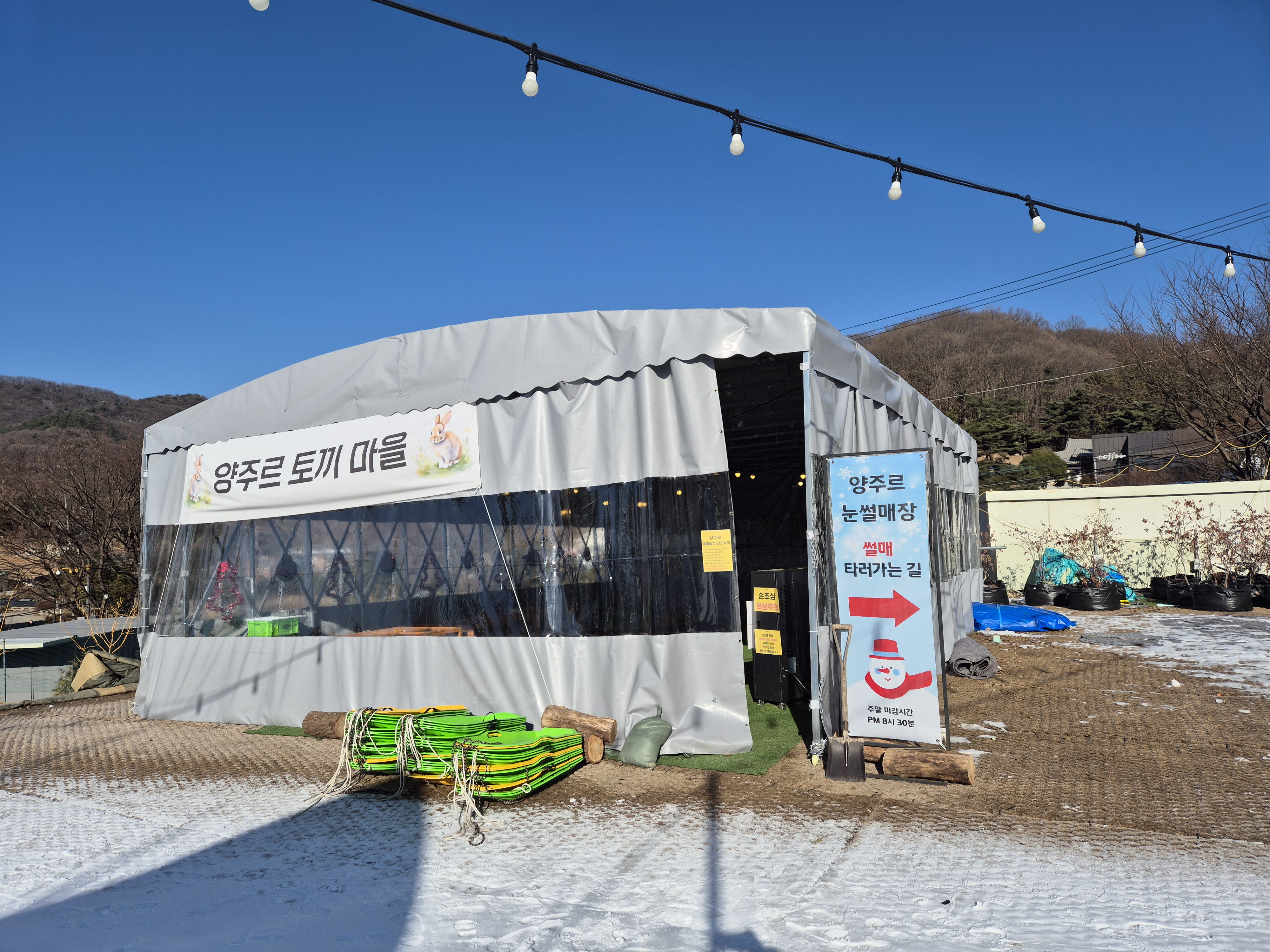 썰매장 올라가기 전에 토끼마을 앞에 썰매를 챙겨 가세요. 간혹 썰매 없이 올라오신 분들이 계셔서요.. ㅎㅎㅎ 한가할 땐 한가한데 또 사람이 몰리면 줄 서서 타야 하니 눈치껏 사람 없을 때 많이 많이 태워 주세요~~^^