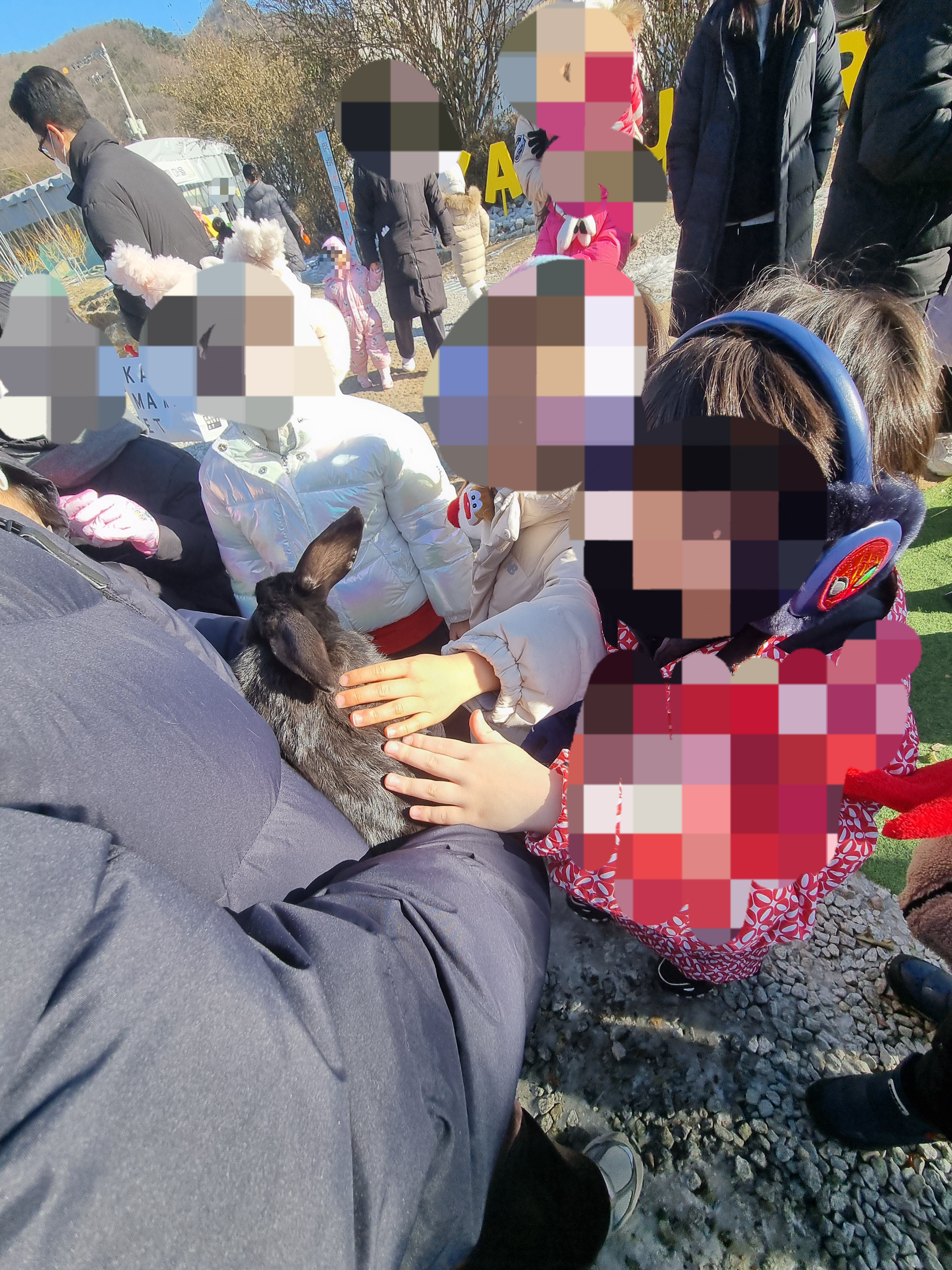 조금 있다가는 토끼 안아 보기 및 먼저 보기 체험도 진행했어요. 아이들이 토끼를 안으면 토끼가 불안해서 물기도 하고 또 토끼가 떨어지면 다치니 어른이 안고 아이들이 만지는 방법으로 진행해요. 이것만을 도 아이들은 엄청 좋아 하긴 하죠~^^ 안아줄 수 있는 어른 한 명 있으면 좋아요. 저처럼 동물 못 만지는 분들은 직원분이 안고 계셔 주니 너무 걱정하지 말아요~