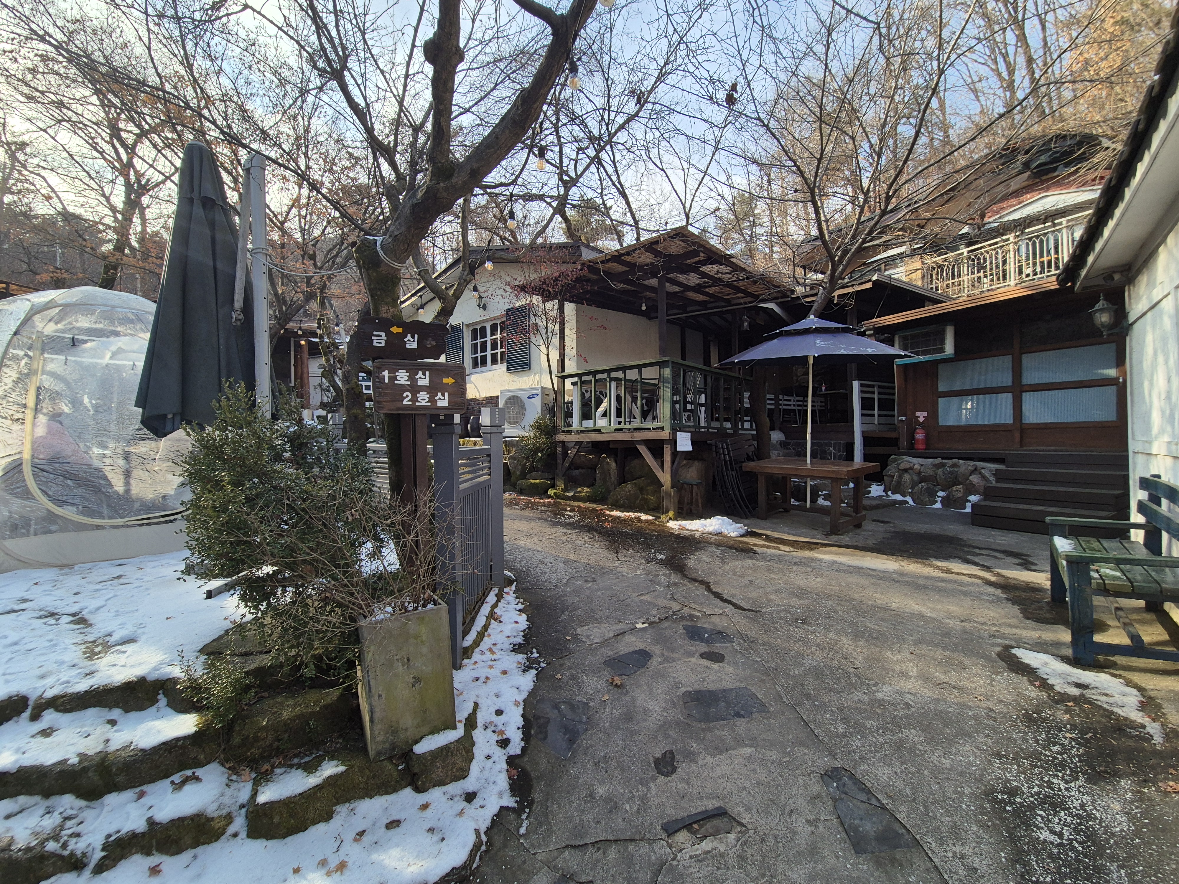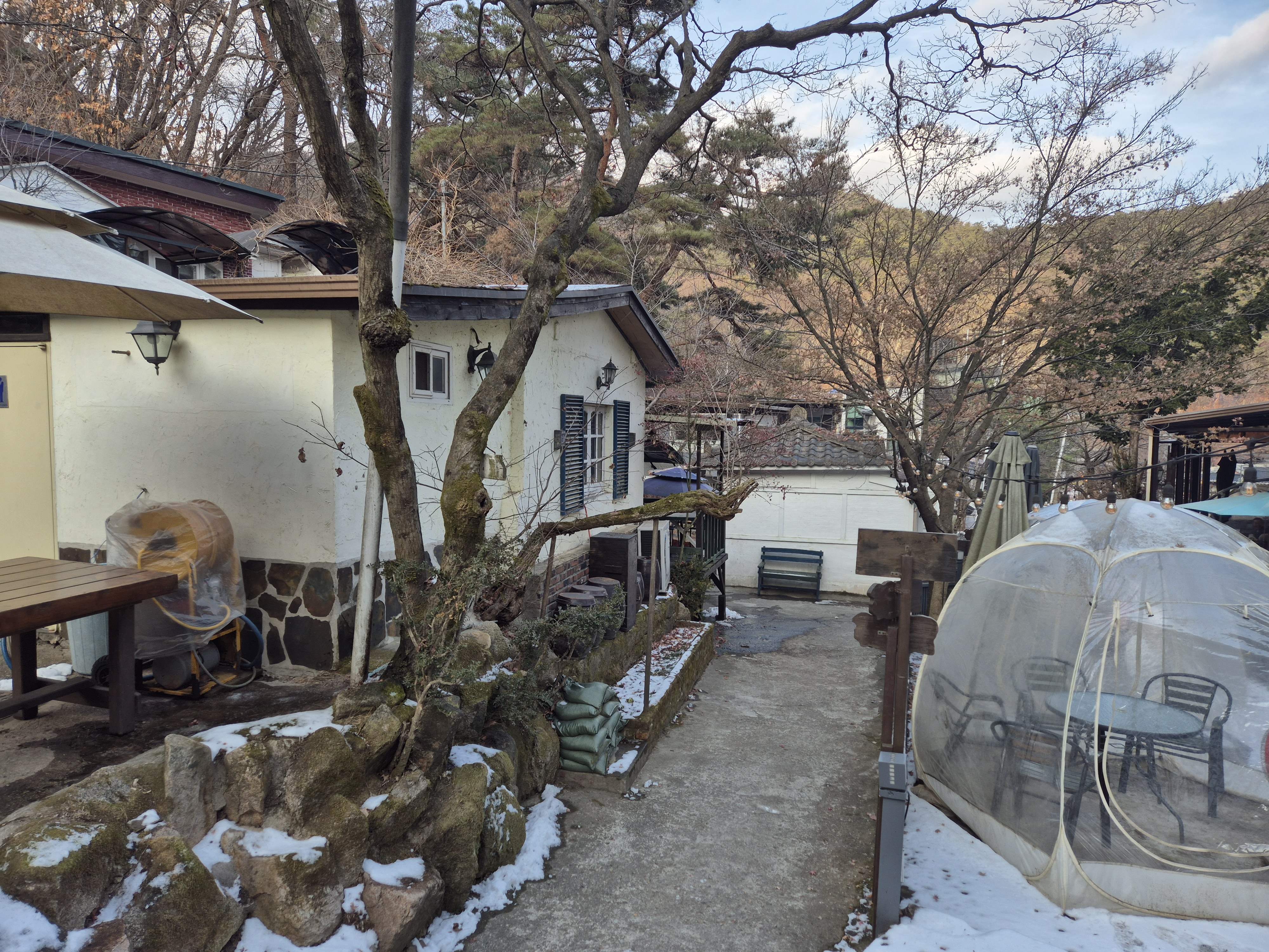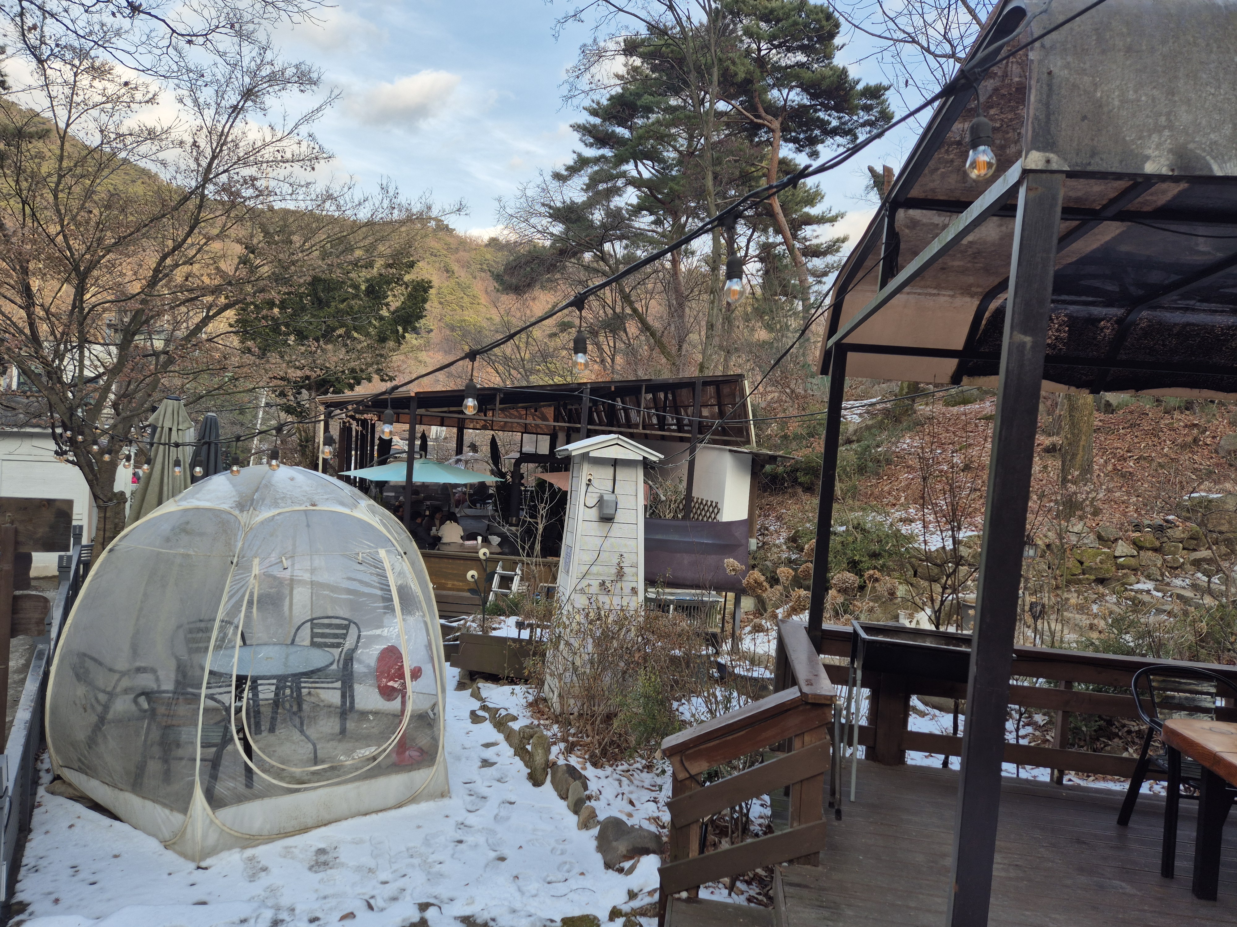 외부테이블에 돔 텐트를 씌워서 추워도 실외에서 머무를 수 있게 했네요. 이용은 안 해 봤는데 난로도 있고 비치되어 있는 답요 갖고 들어가 있으면 이색적이고 좋을 거 같아요.
