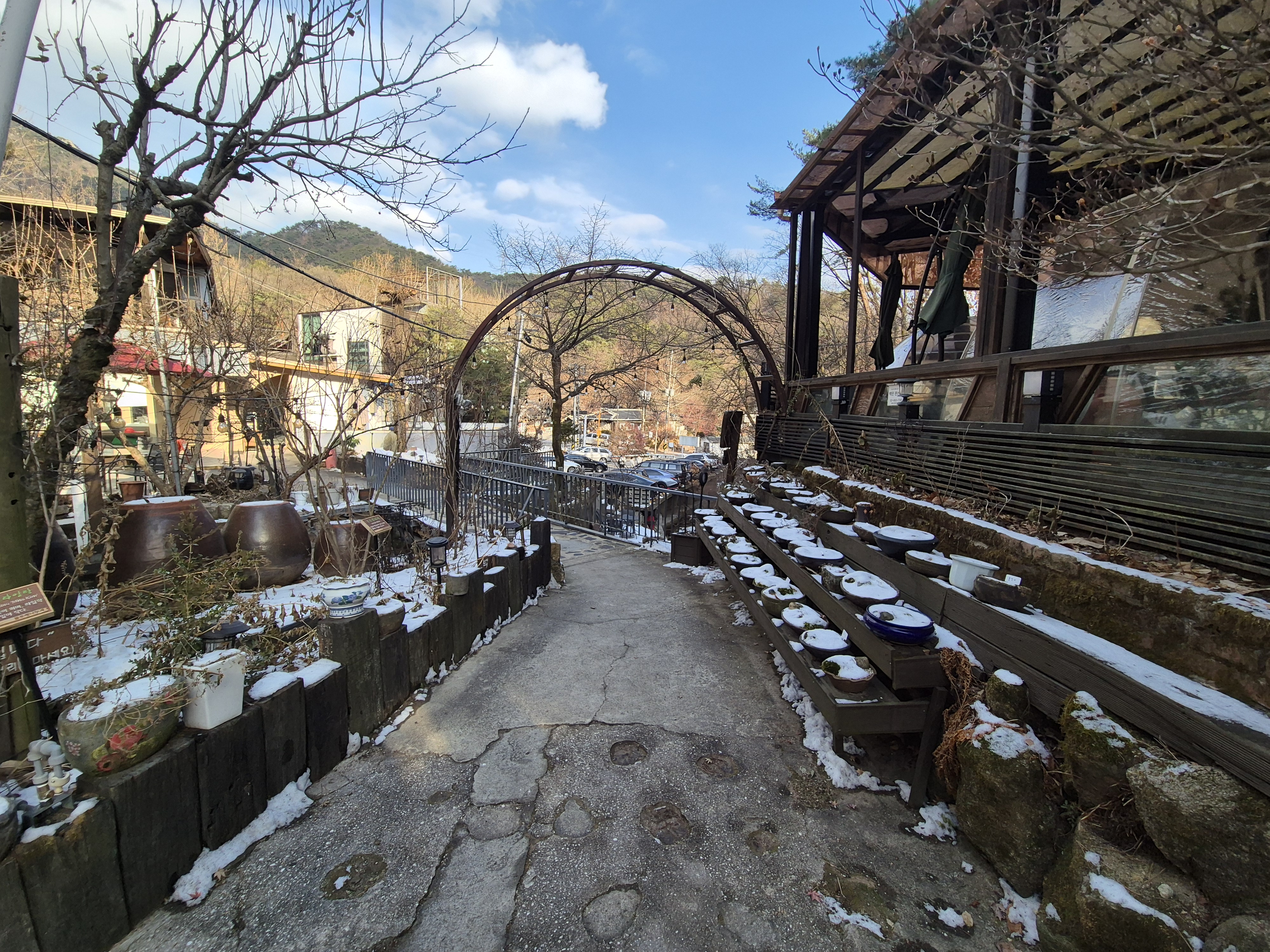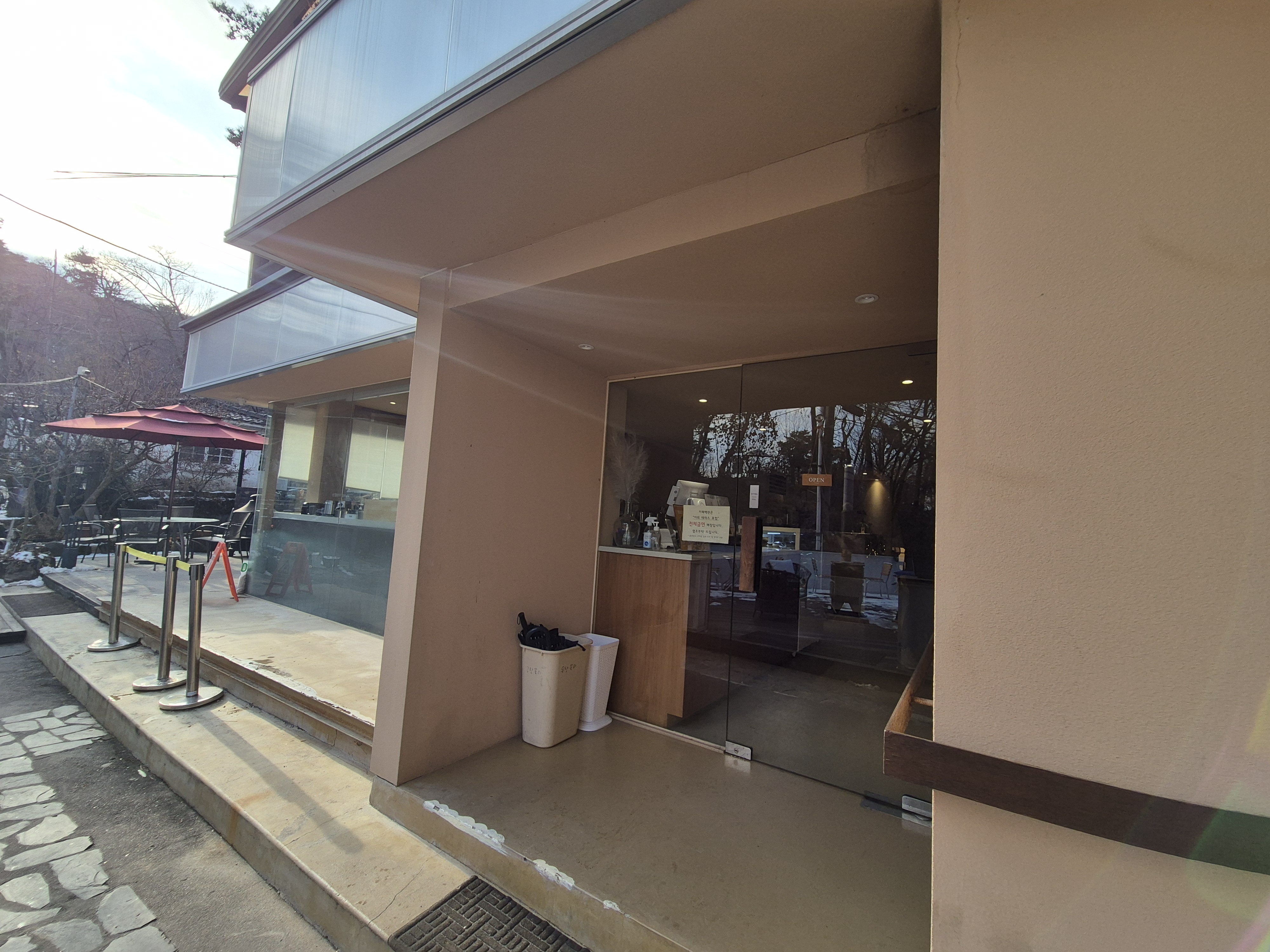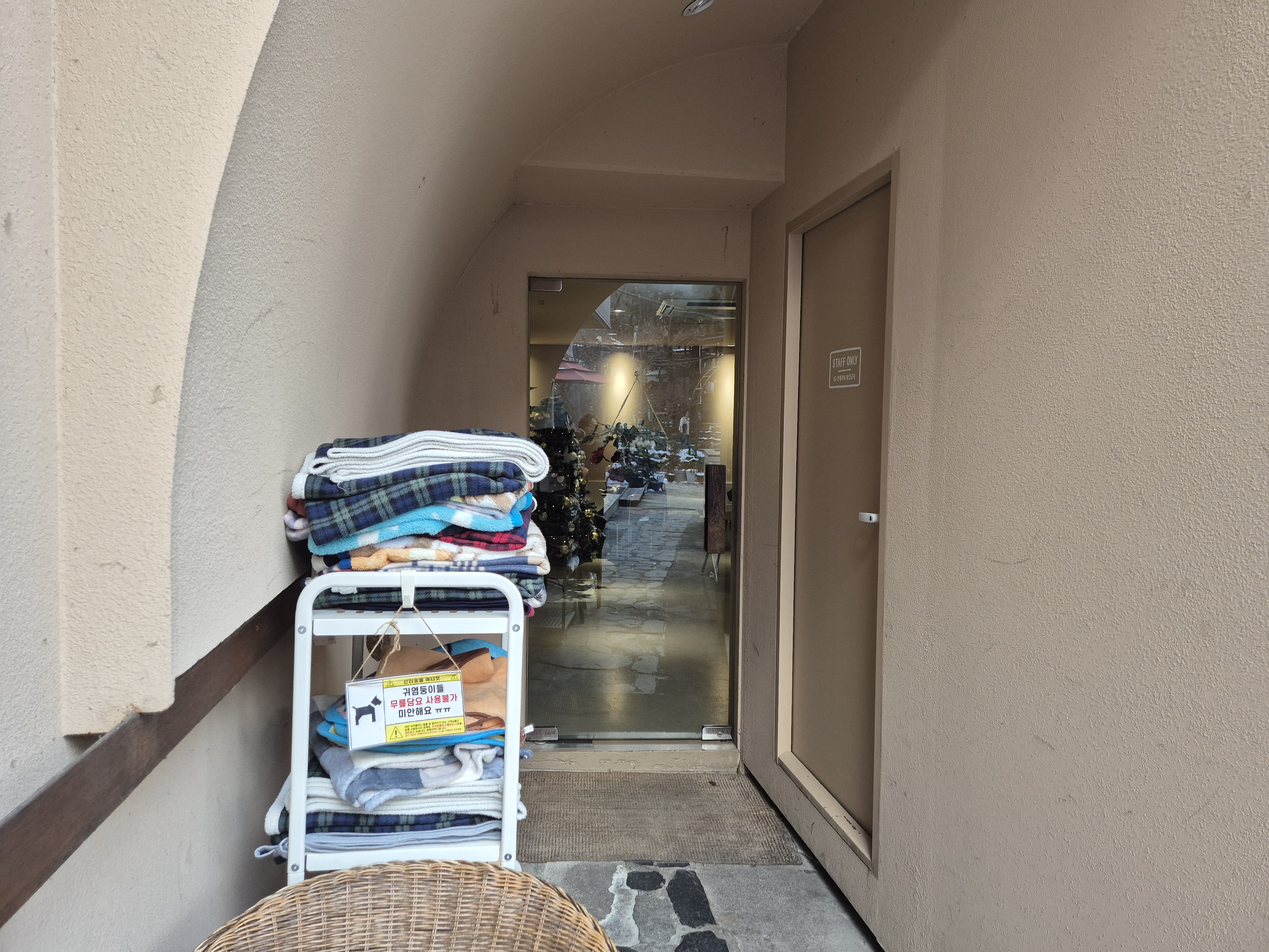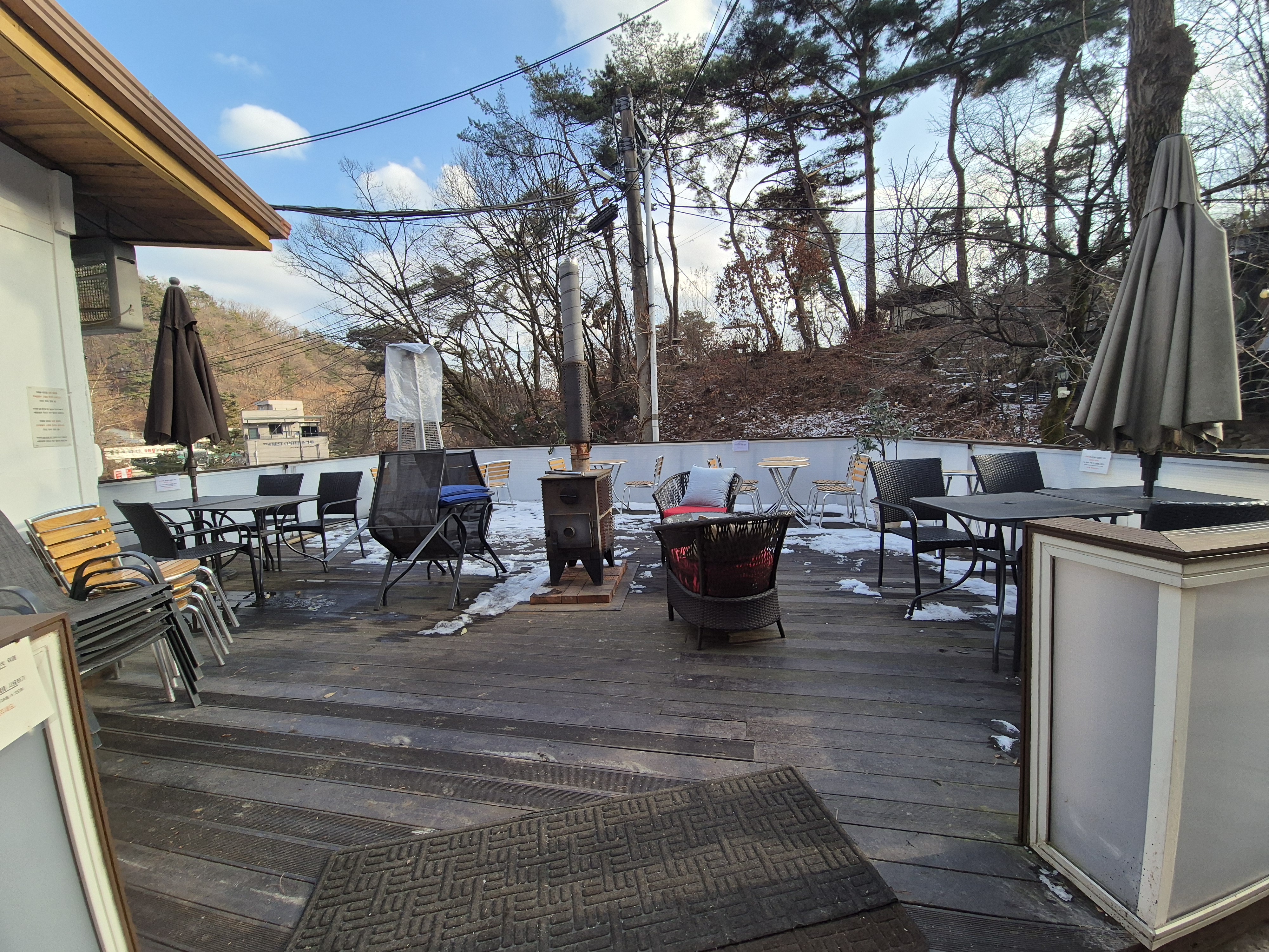 외부테이블에 돔 텐트를 씌워서 추워도 실외에서 머무를 수 있게 했네요. 이용은 안 해 봤는데 난로도 있고 비치되어 있는 답요 갖고 들어가 있으면 이색적이고 좋을 거 같아요.