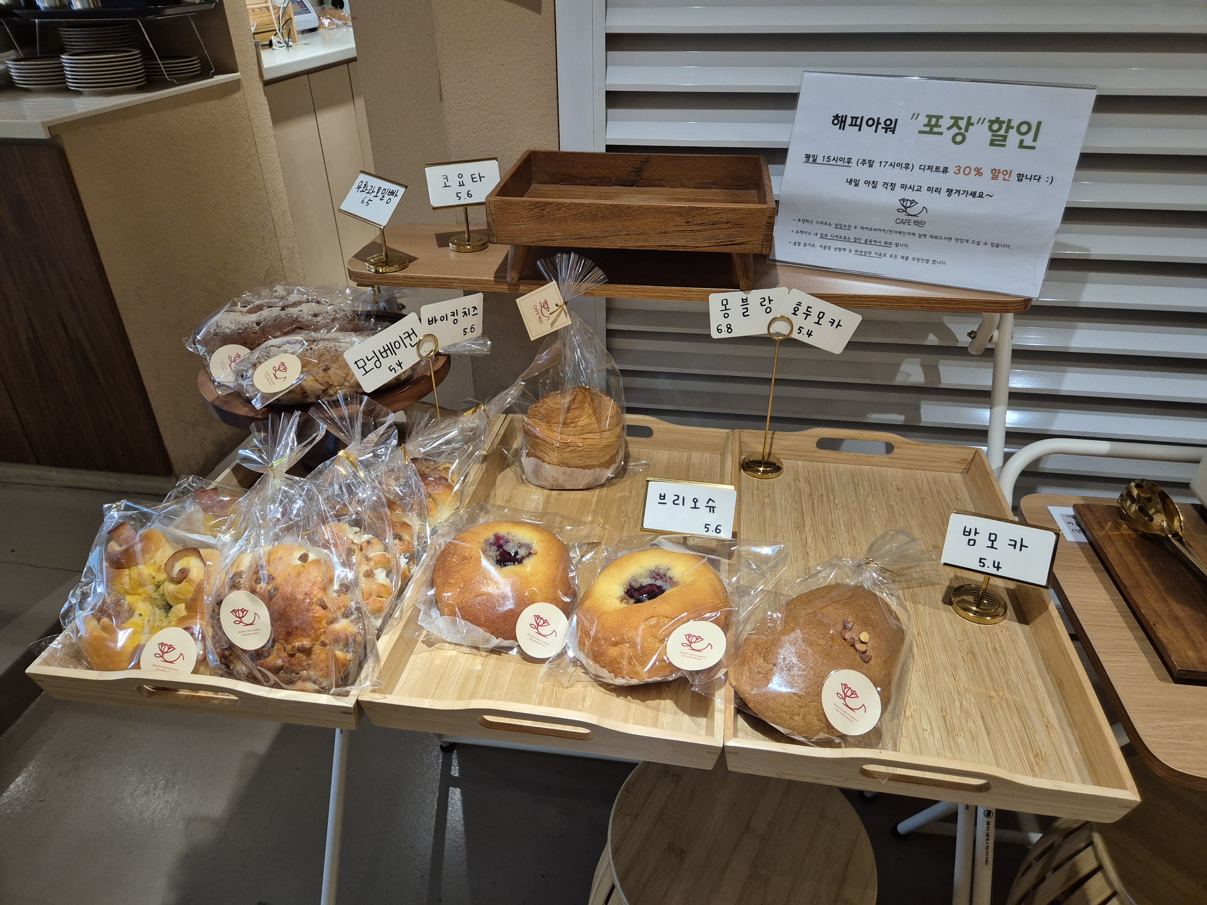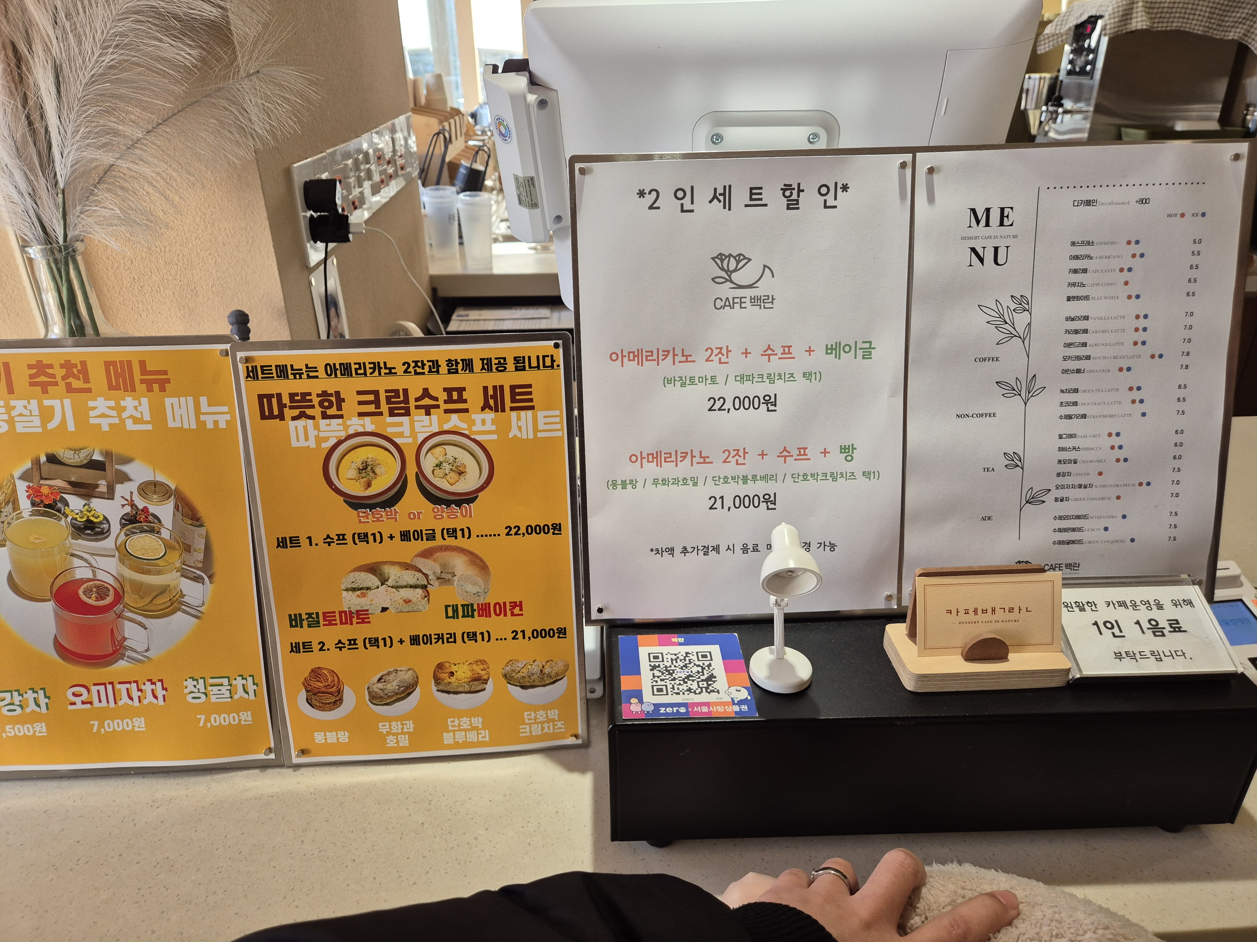 백란은 따뜻한 크림 수프도 판매하고 있어서 추운 날 좋을 거 같아요. 저희는 식사를 하고 왔기에 커피만 마셨지만 수프랑 베이글 먹어보고 싶기도 했어요. 그리고 백란은 다른 카페에서는 보기 힘든 2인세트 할인이 있어요. 구성이 좋더라고요^^ 다음 방문 때는 2인세트 시켜야겠어요.