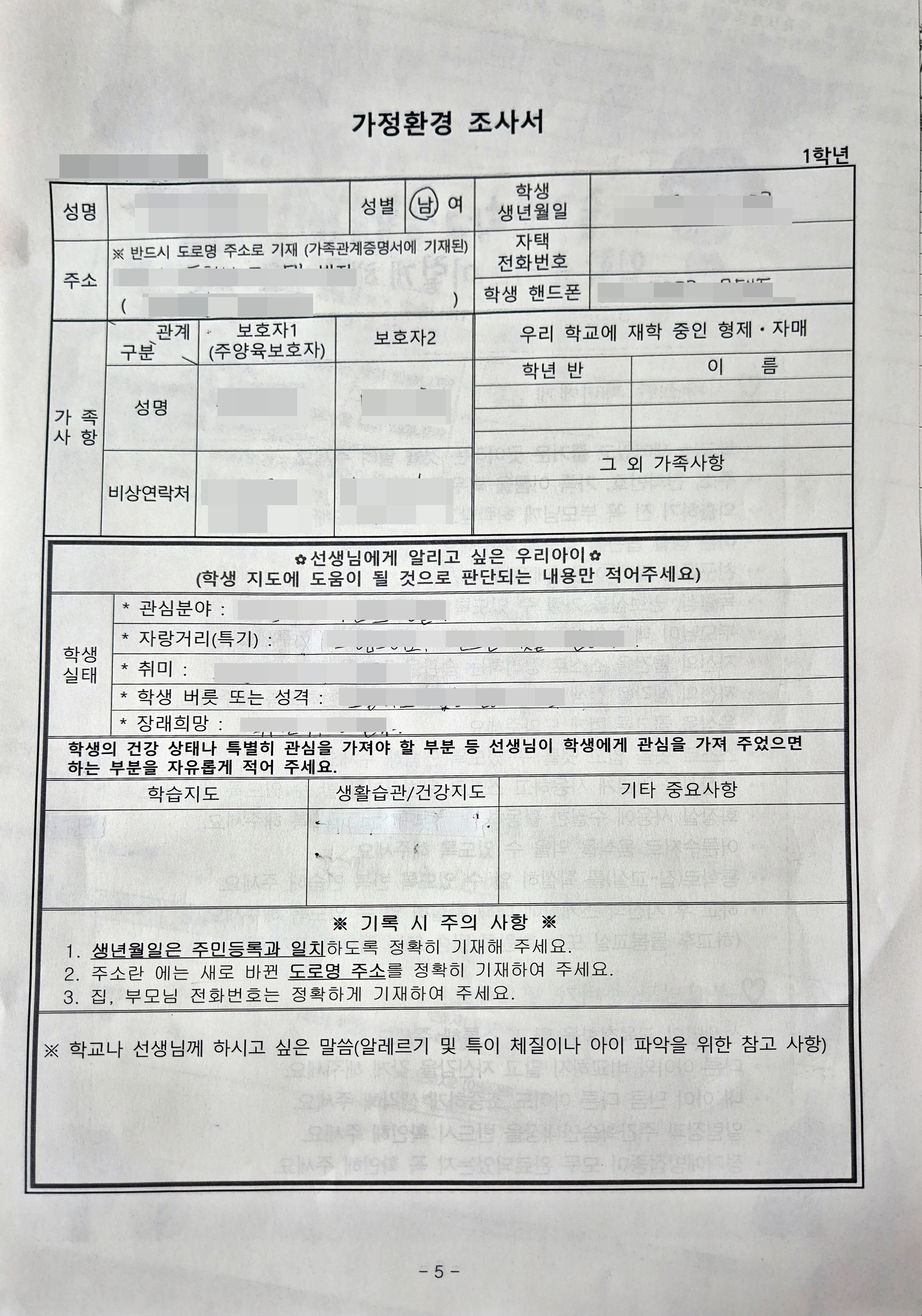 학생기초 조사서 작성/가정환경 조사서