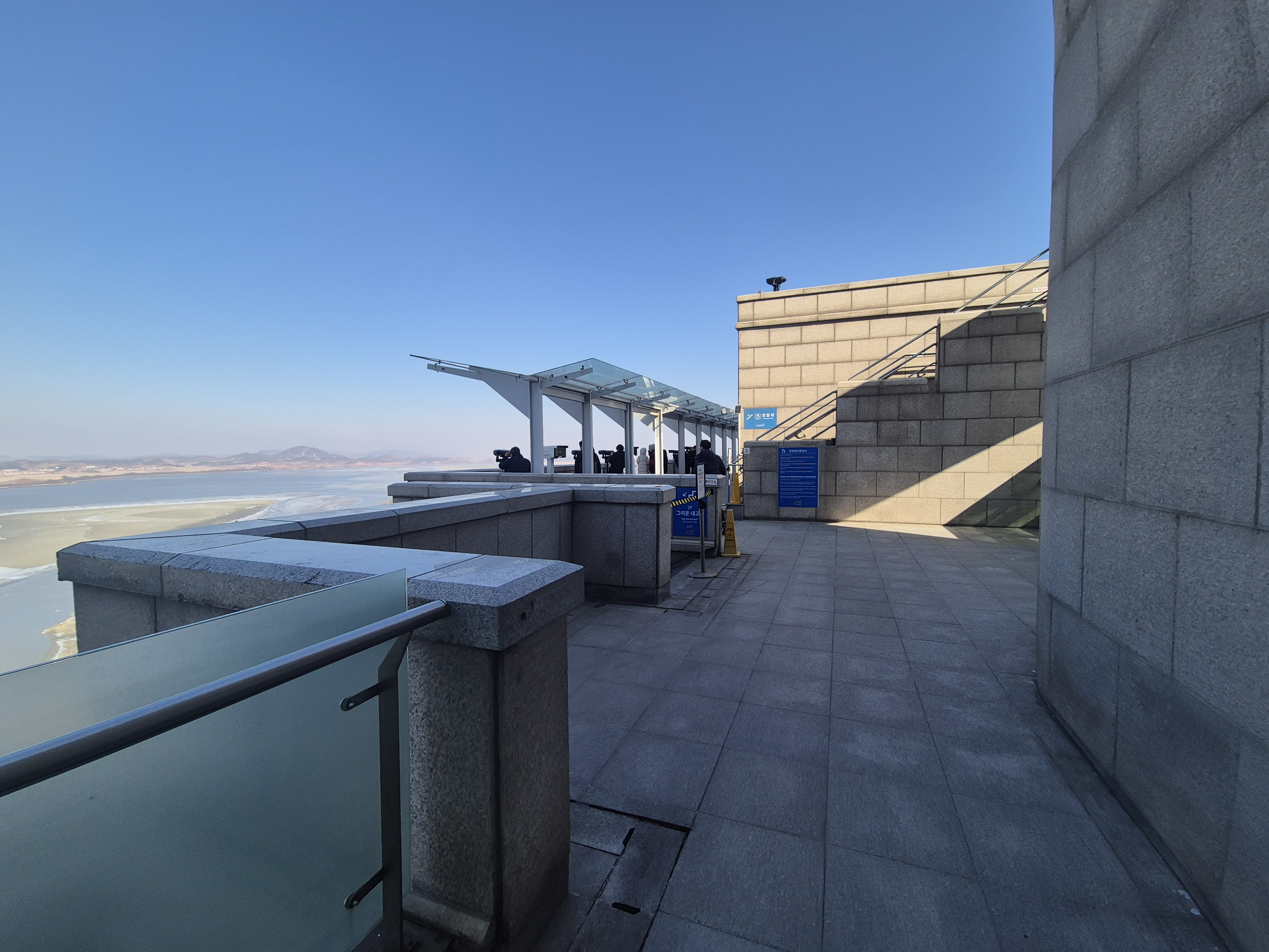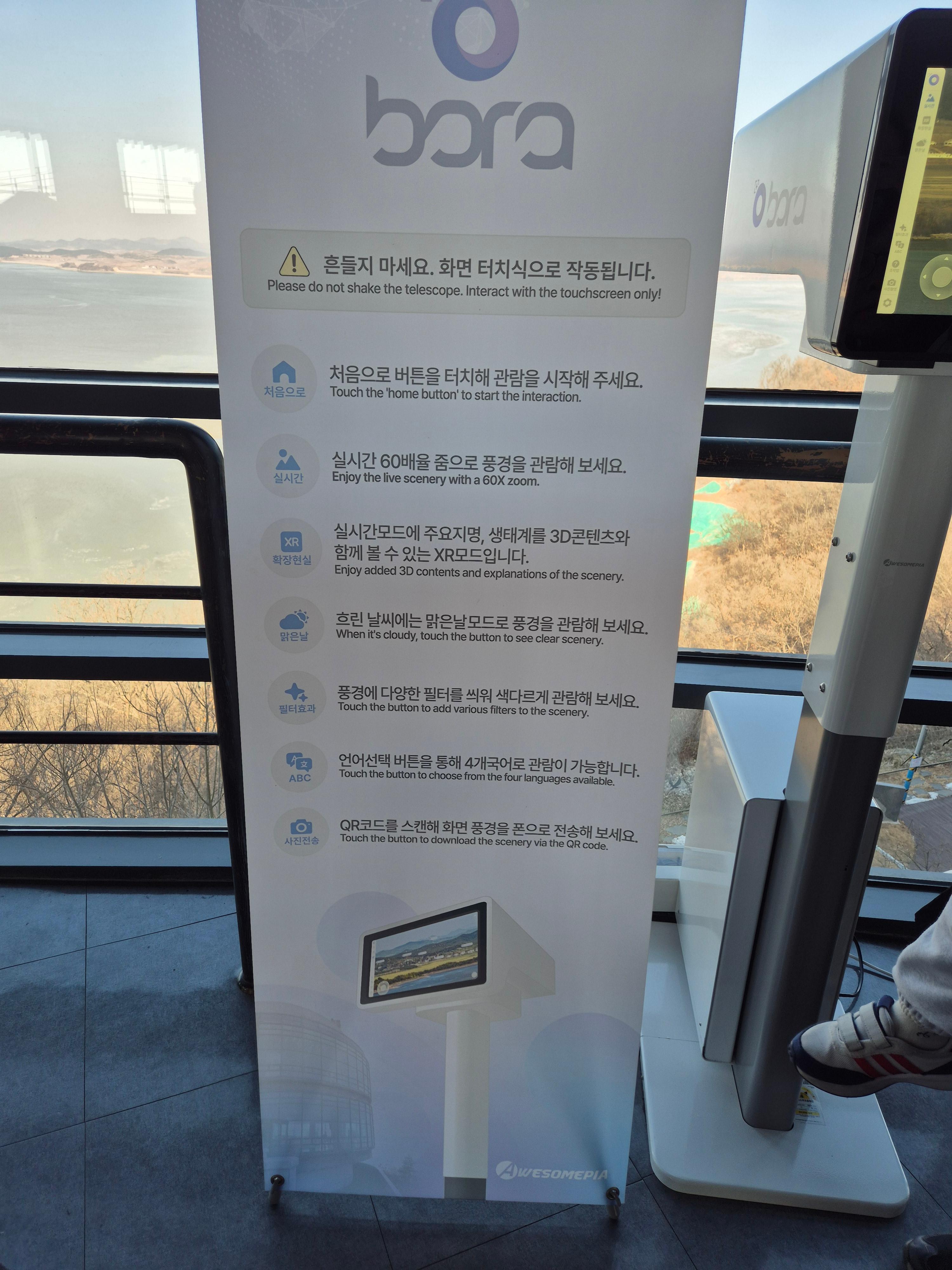 외부에서도 망원경이 있어서 북한을 더 자세히 바라 볼 수 있어요. 쌀쌀한 날씨 였는데 북한 사람 구경으로 추위도 잊고 계속 보게 되는 중독성 강한 망원경. 아무리 생각해도 신기 신기. 북한은 정말 차가 없나봐요.... 한대도 못 봤어요. 망원경이 또렷이 보이는건 아니여서.... 움직임이 소달구지로 추정하는데.... 소 달구지 아실까요? 그 있잖아요... 소가 끄는 우차 같은건데 사람도 싣고 짐도 싣고 사디는거.... 그런거 몰고 가는 사람은 보았어요... 정말 우리나라와 많은 차이가 있는거 같은데... 흠...