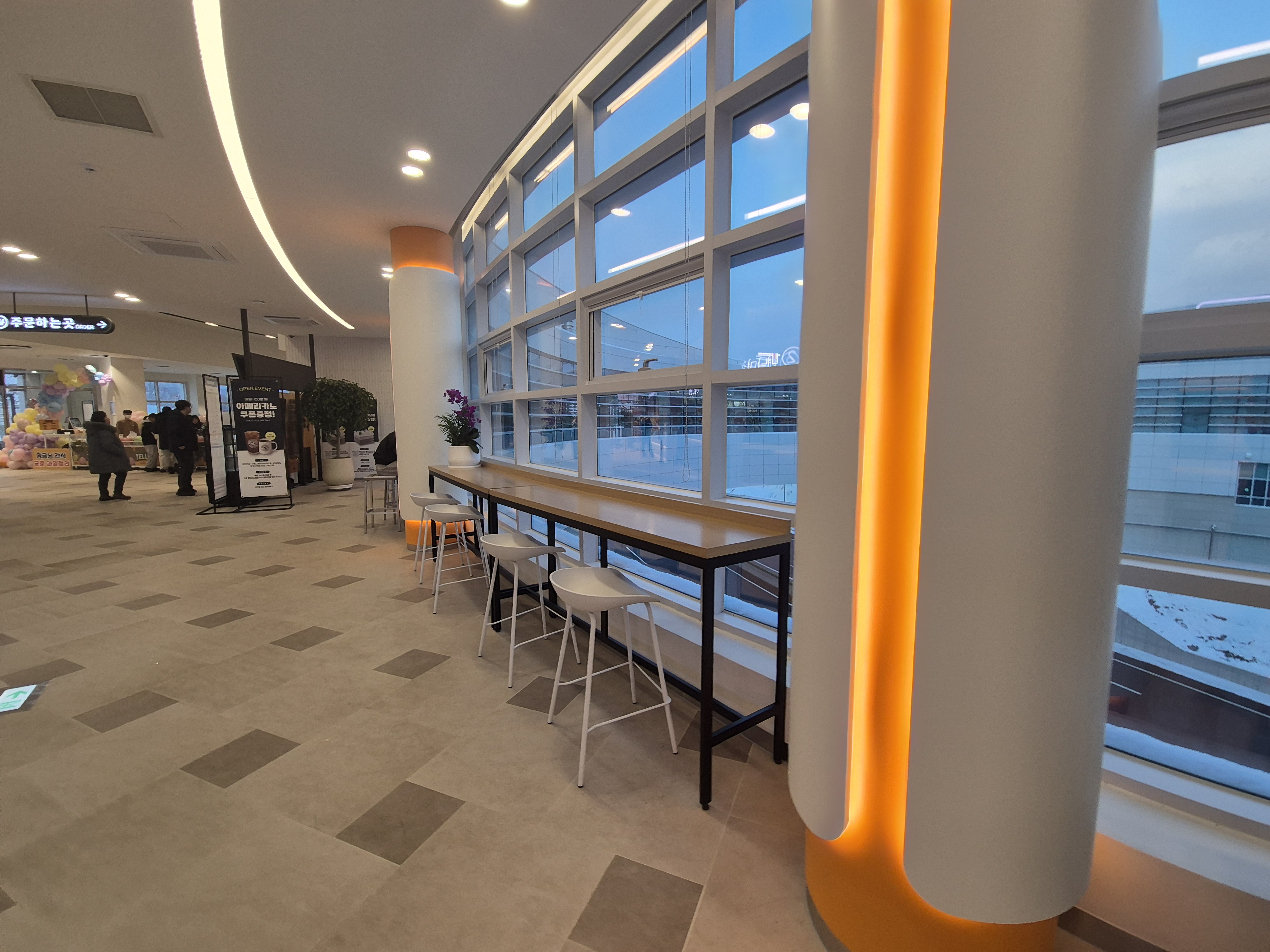세종포천고속도로 세종방향에서 처인휴게소 들어온 모습이에요. 이마트 24도 있고 신나는 행사 체험도 보이고 휴게소의 즐거움 간식거리들이 보입니다. 그리고 에스칼레이터 타고 올라가면 식당가와 에버랜드 존이 있어요. 2층을 쭈~욱 돌면 원형으로 이루어져 있어서 제자리로 돌아올 수 있어요~^^ 고속도로 위에 위치한 처인휴게소는 식당내에서 고속도로 view를 보며 식사와 음료를 먹으며 잠시 쉬어가기 좋더라고요. 창가 자리에 특색있는 자리를 마련해서 어느 명소에서 즐기는 기분~. 그만큼 자리 잡기가 치열 하긴 합니다.