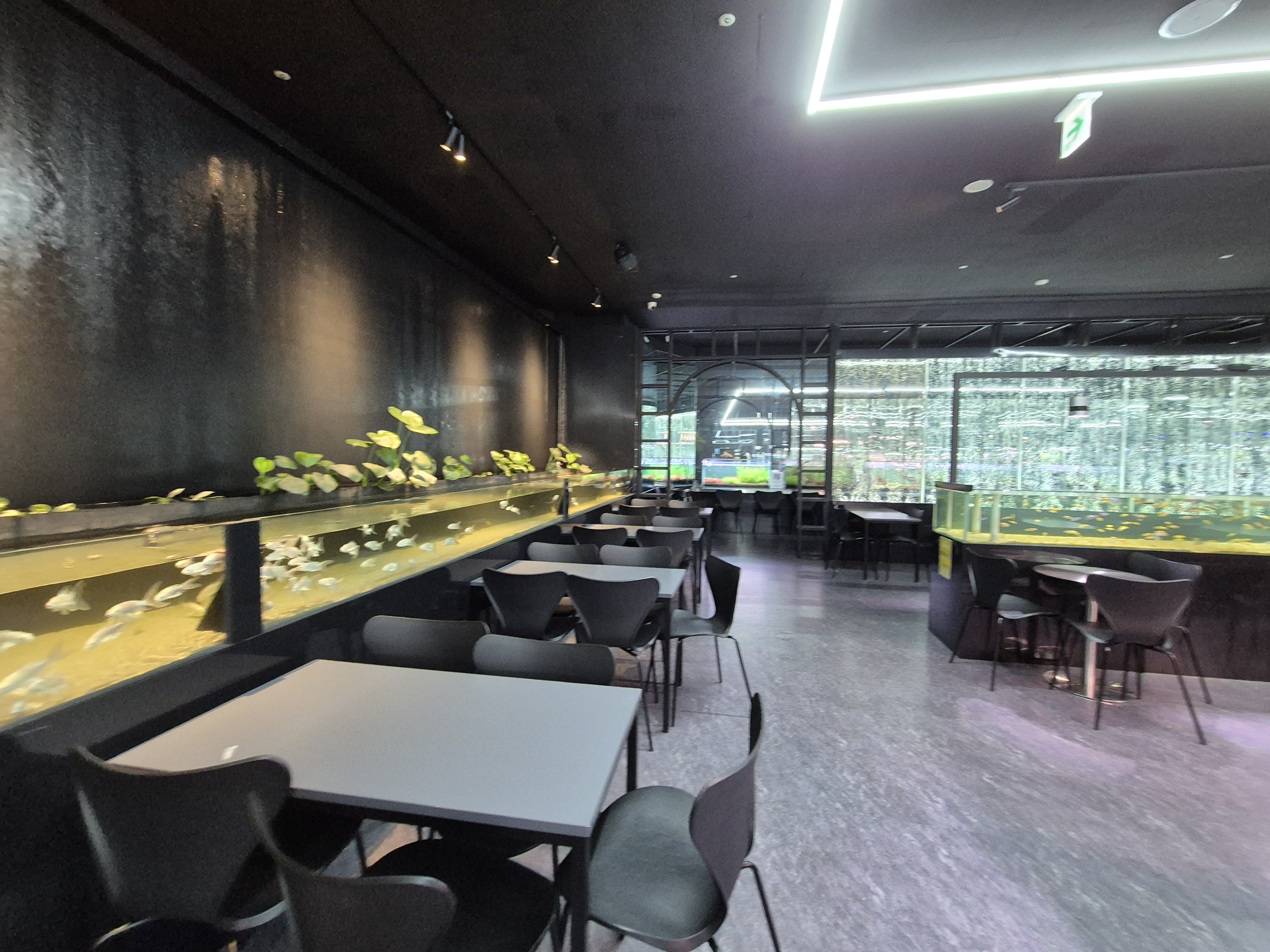 어항? 수조? 옆으로 테이블이 있어서 앉아서 물고기들 노는 거 바라보고 있으면 시간 가는 거 모르겠더라고요^^ '물멍'이라고 하죠. 혼자 왔으면 정말 실컷 물멍 하고 싶었는데.... 아이들과 온 이상 테이블에 앉아 있을 시간은 없어요^^ 아무 곳에나 자리 잡으세요~ 아쿠아 카페라서 물 비린 내 나면 어쩌나 걱정을 조금 했는데 걱정과 다르게 물비린내는 없었어요. 직원분들이 부지런히 물 관리를 하고 계시는 모습을 목격! ^^ 관리가 잘돼 있더라고요.  깔끔하고 깨끗해서 아이와 가기 진짜 부담 없습니다~