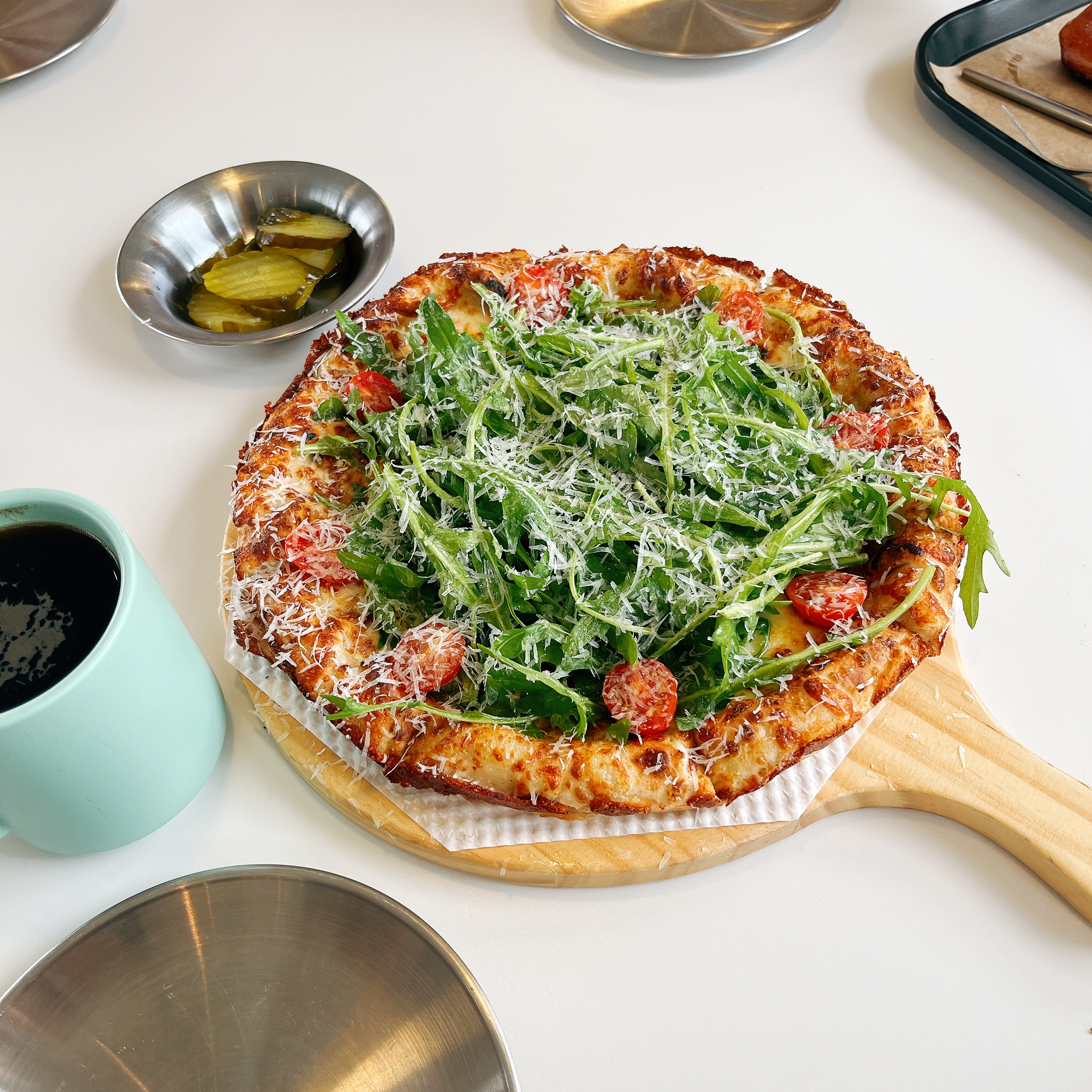 이건 제가 시켜 먹은 피자 인데 루꼴라가 올라가서 신선하고 도우가 바삭 ! 그리고 생각하지도 않았는데 치즈크러스트가 둘러져 있어요!!!! @-@