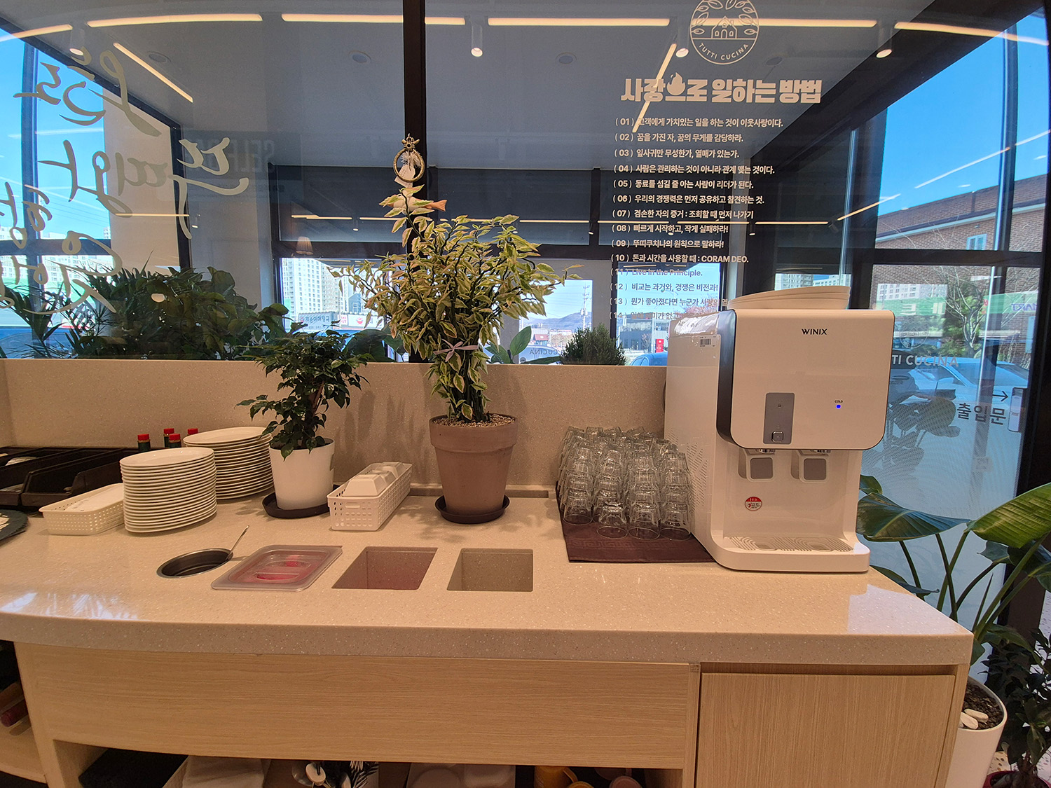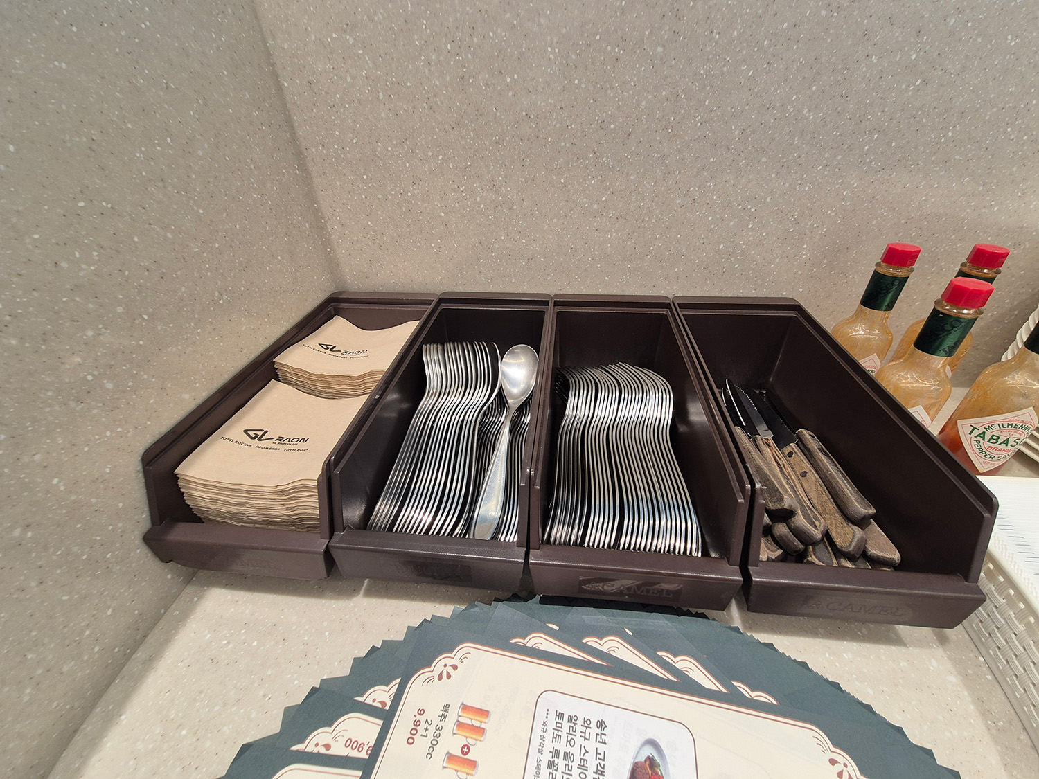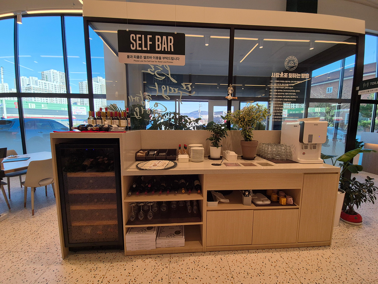 셀프바가 있어서 필요한 것 눈치 볼 필요 없이 리필 가능해요^^  아이들 식기도 있고 물티슈도 여기에 있어요.