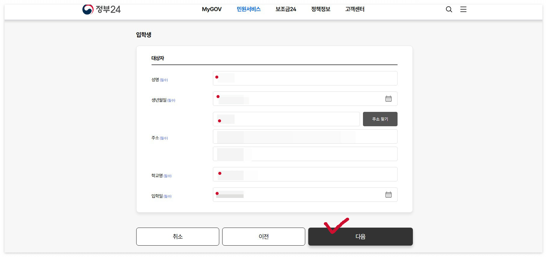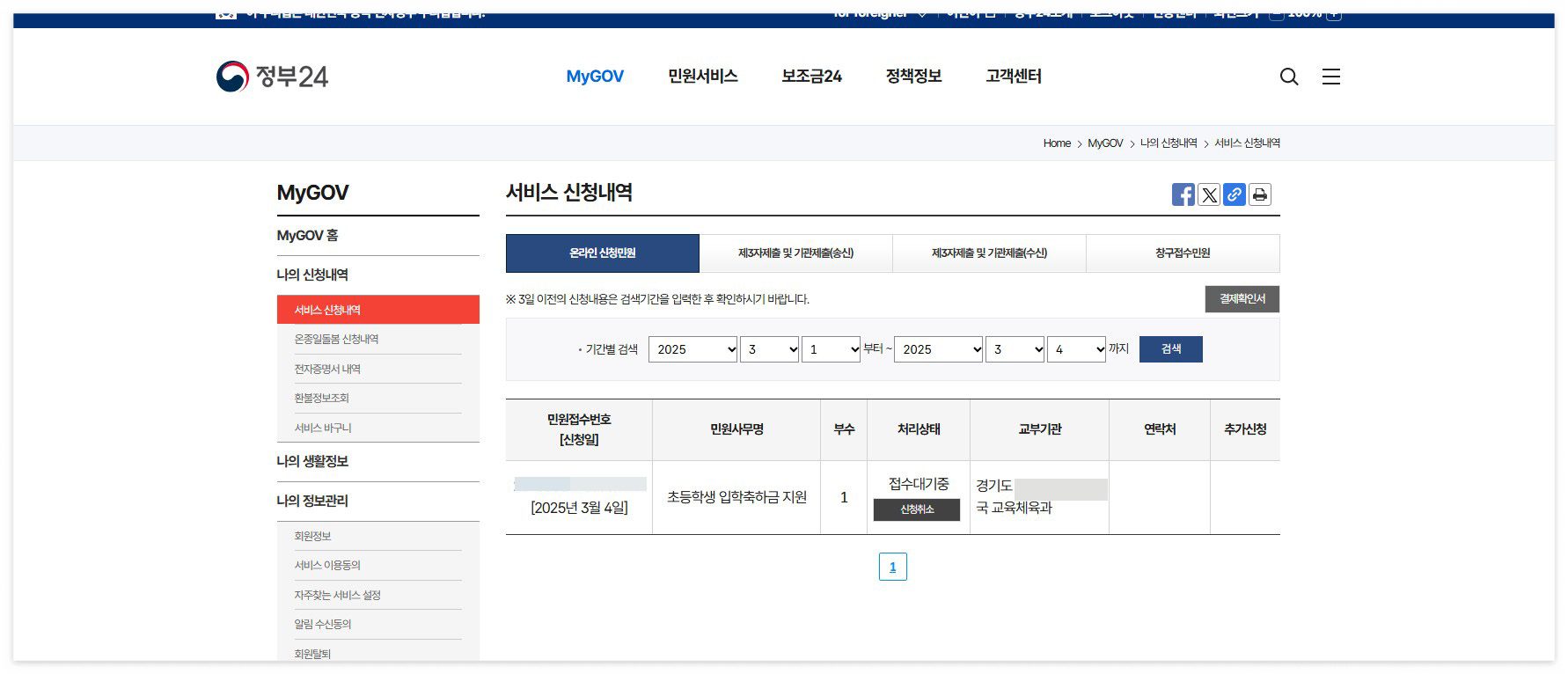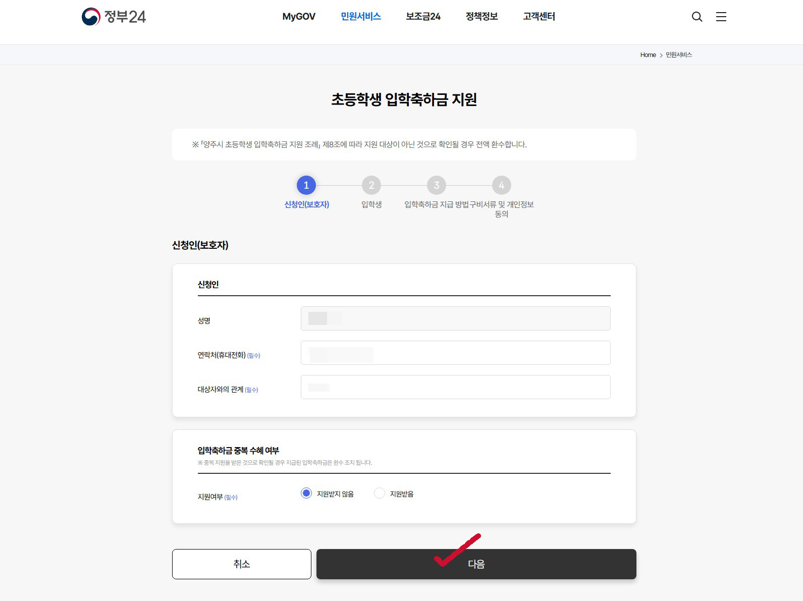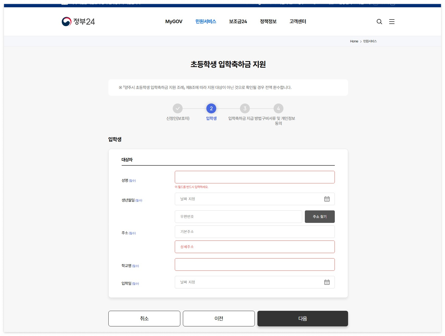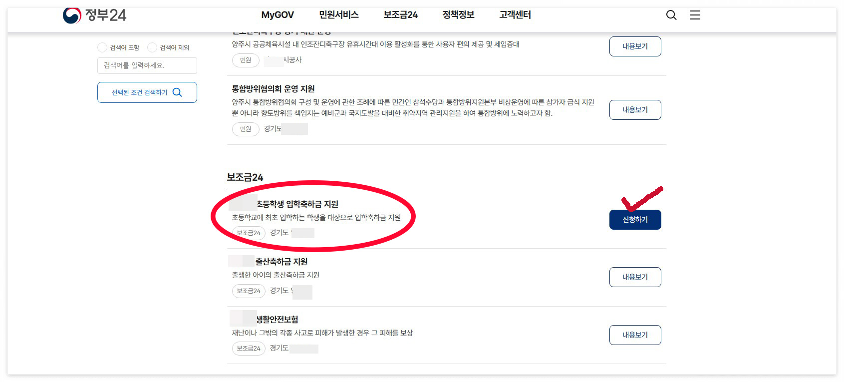 보통 학교에서 안내를 해주시는데 안내가 안되거나 홍보가 부족한 부분은 본인이 스스로 챙겨야 겠죠?^^;;;; 정부24에서 들어가서 '초등학생 입학축하금' 검색하시면 해당지역 지원금이 가능한지 정확하게 나옵니다.