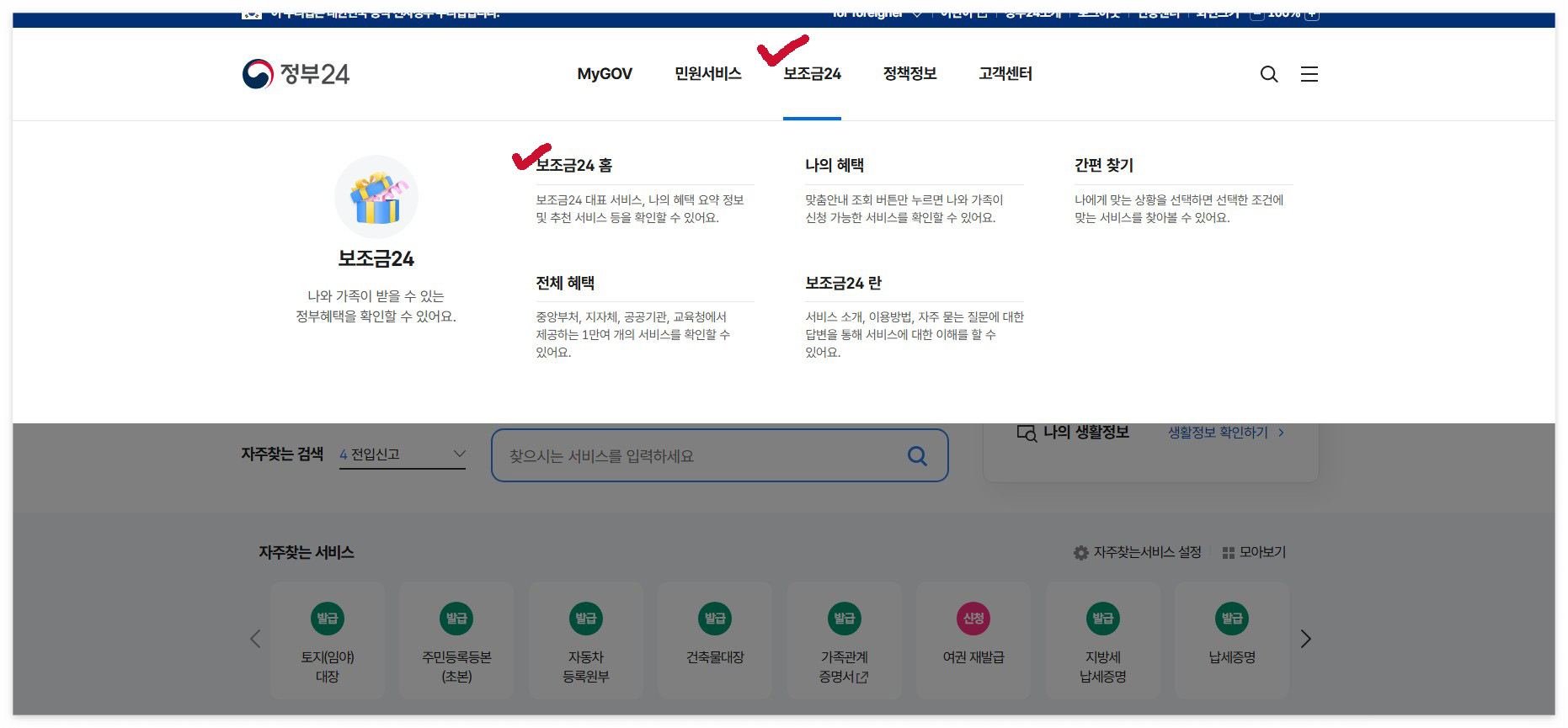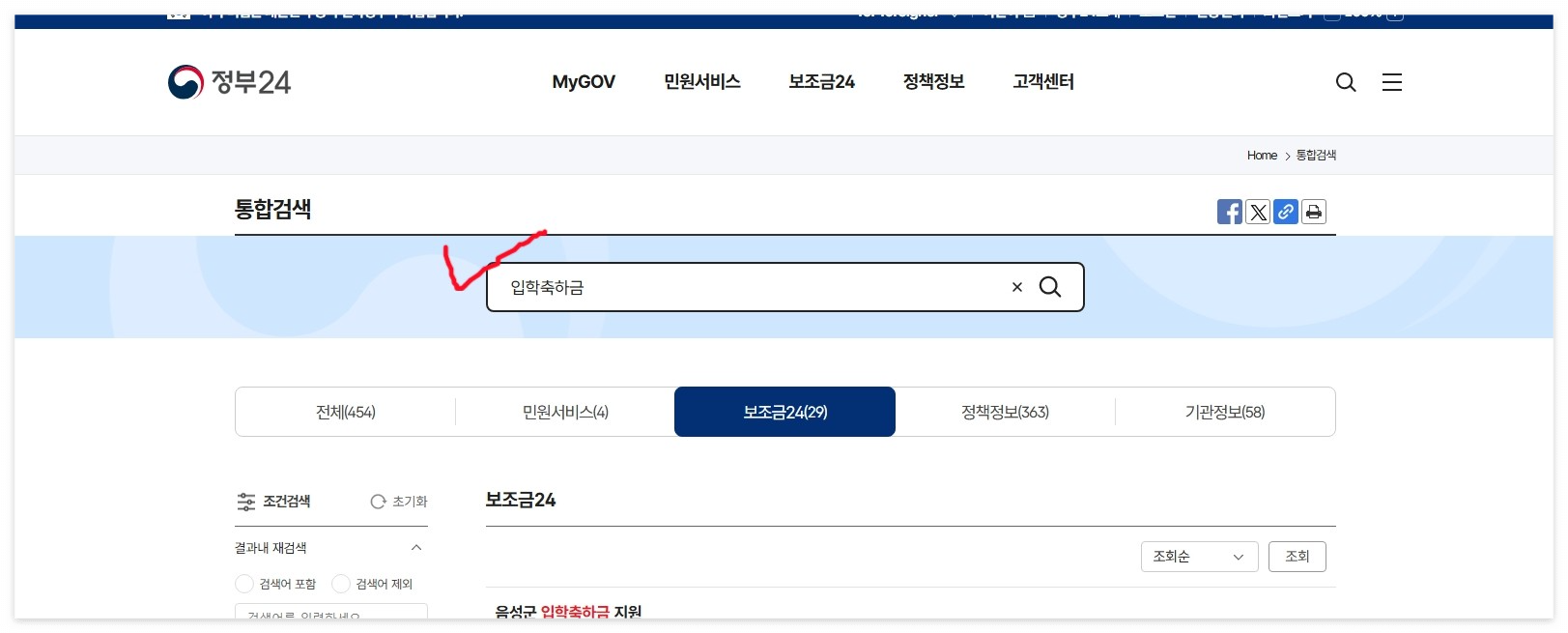 정부24 로그인- 보조금24-보조금24 홈- '입학축하금'검색 - 해당 지역 입학축하금 신청하기.