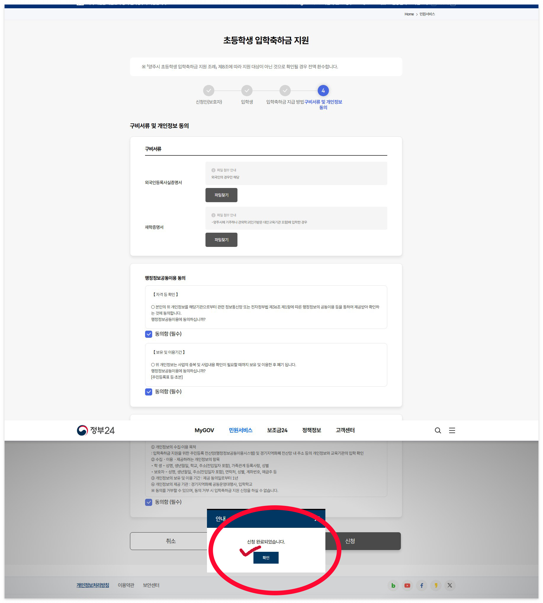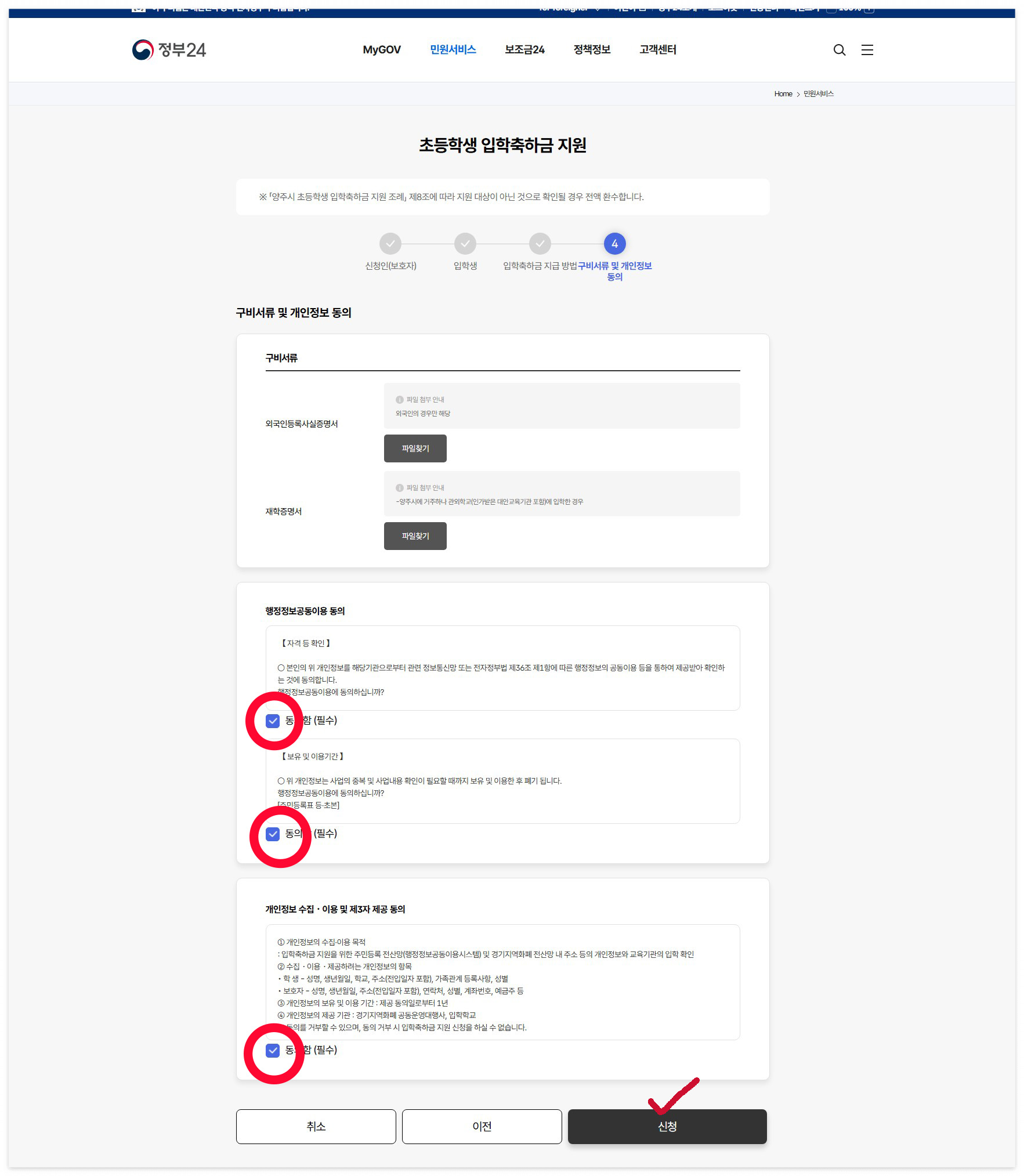 8. 이제 다 왔어요. 구비서류는 없어요. 밑에 동의 읽어보시고 동의에 체크 , 체크.