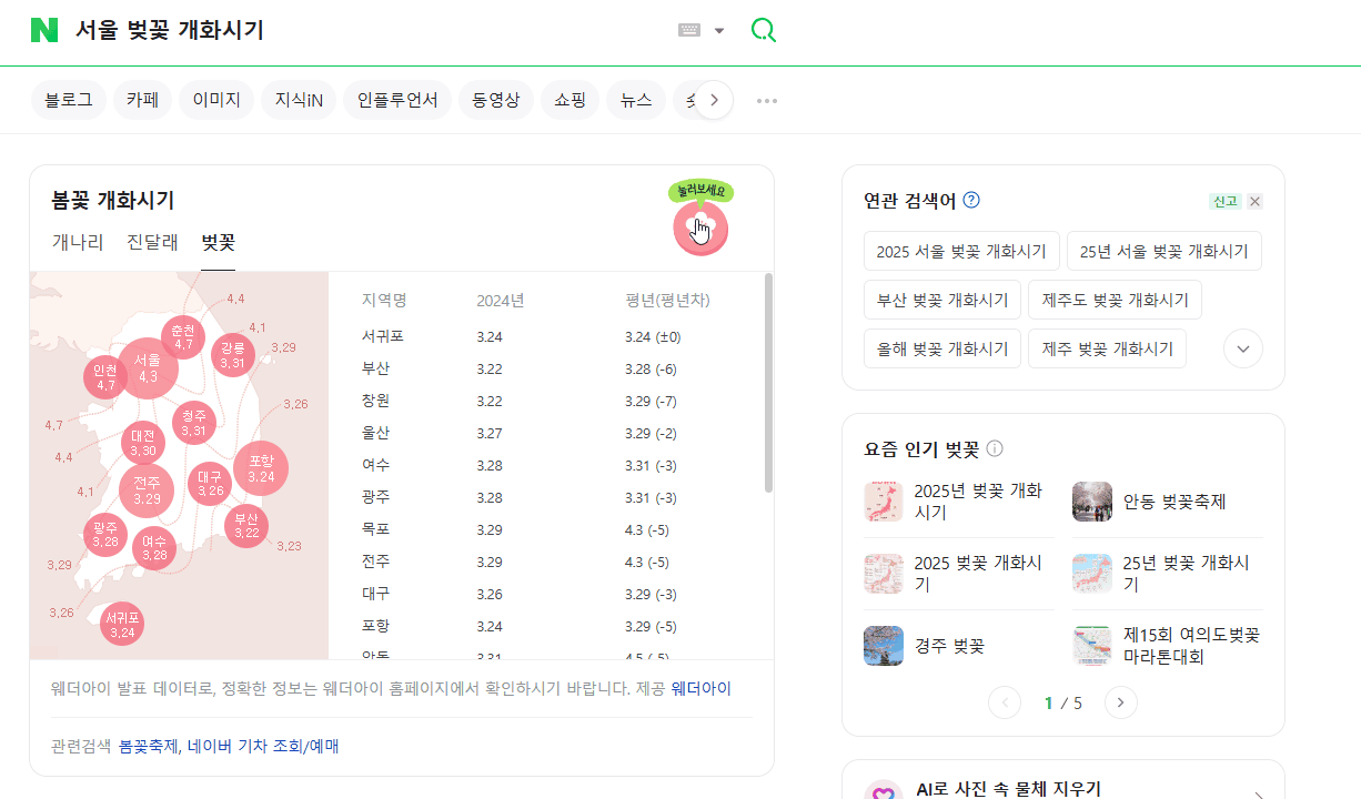 '서울 벚꽃 개화시기'의 네이버 검색 결과입니다.