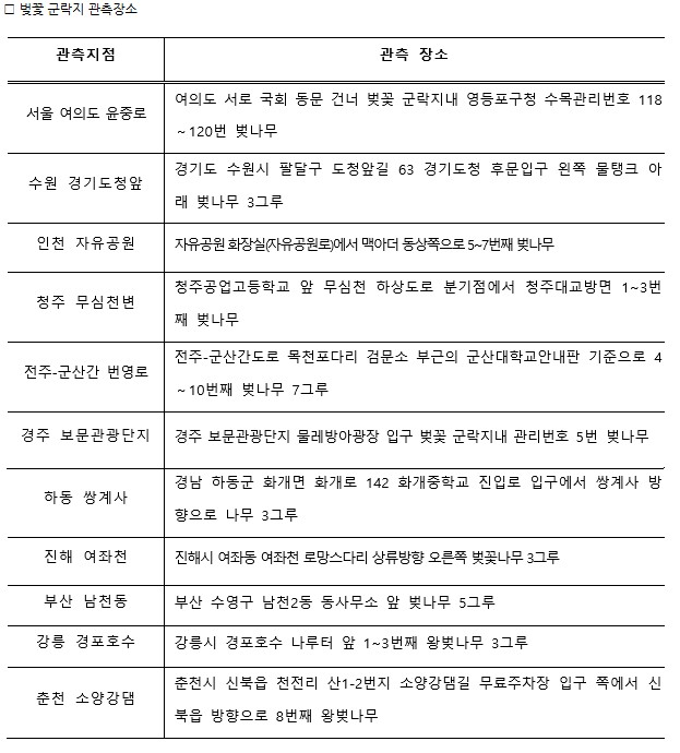 벚꽃은 3월22일 제주도 서귀포를 시작으로 남부지방은 3월 22일 ~ 3월 30일, 중부지방은 3월 29일~4월 4일, 경기 북부와 강원 북부 및 산간지방은 4월 4일 이후에 개화할 것으로 예상 된다고 합니다. -출처: 웨더아이