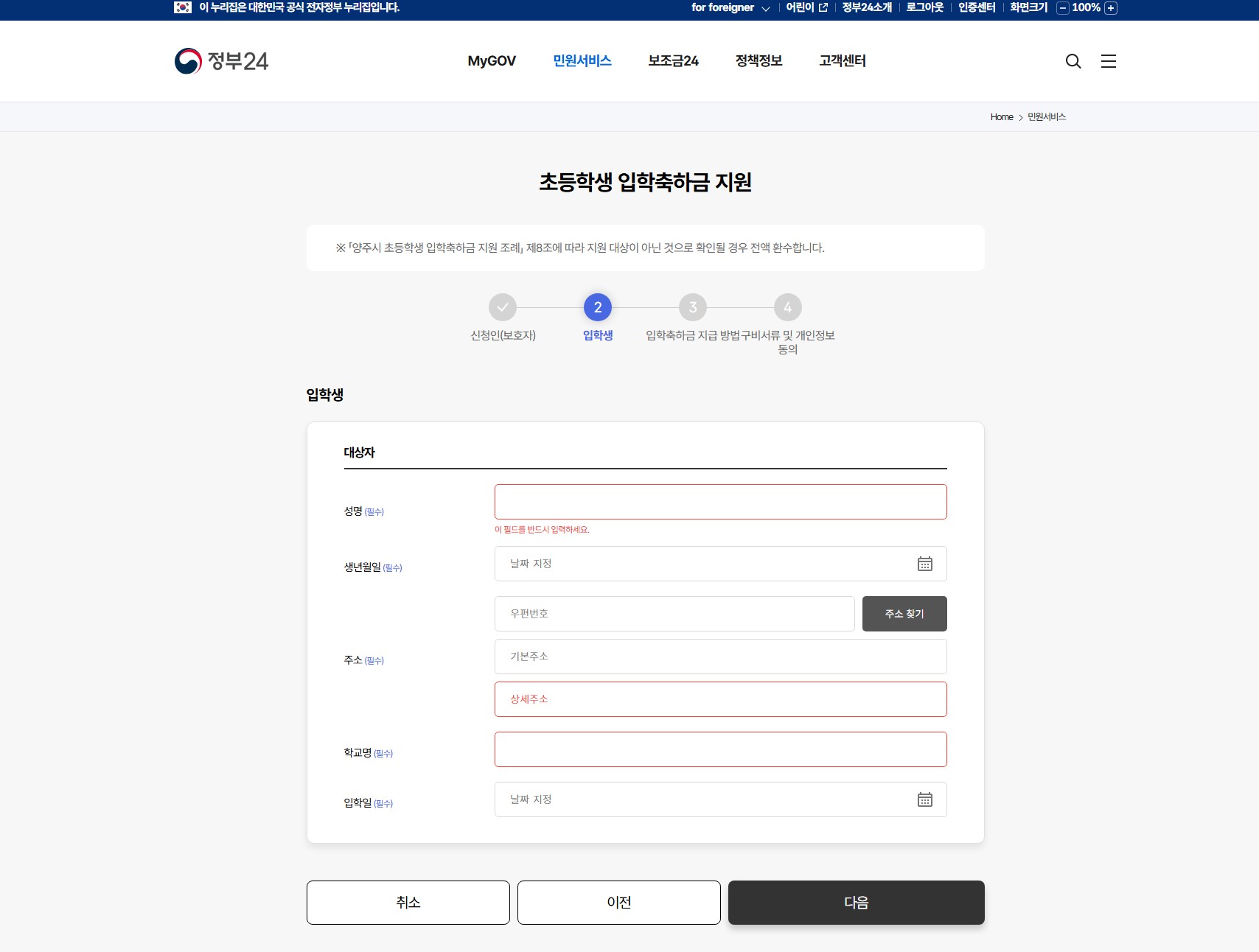 - 양주시 초등학생 입학 축하금 신청 완료.