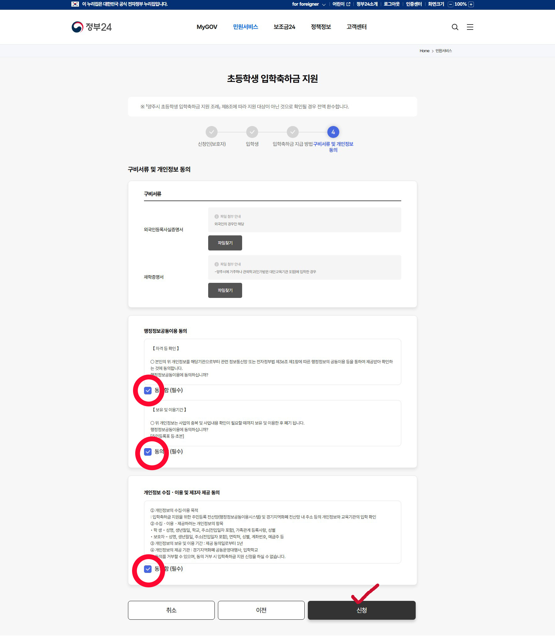 4단계 구비서류 및 개인정보 동의 - 외국인 등록사실증명서는 '외국인'인 경우만 해당이니 한국인은 패쓰, 재학증명서는 양주시에 거주하지만 관외학교(인가받은 교육기관 포함)에 입학한 경우만 구비서류 첨부하면 됩니다.