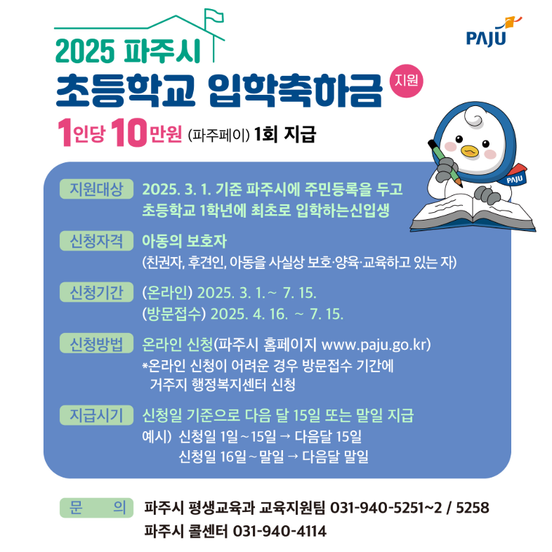 - 지원근거 : 파주시 초등학교 입학축하금 지원 조례
