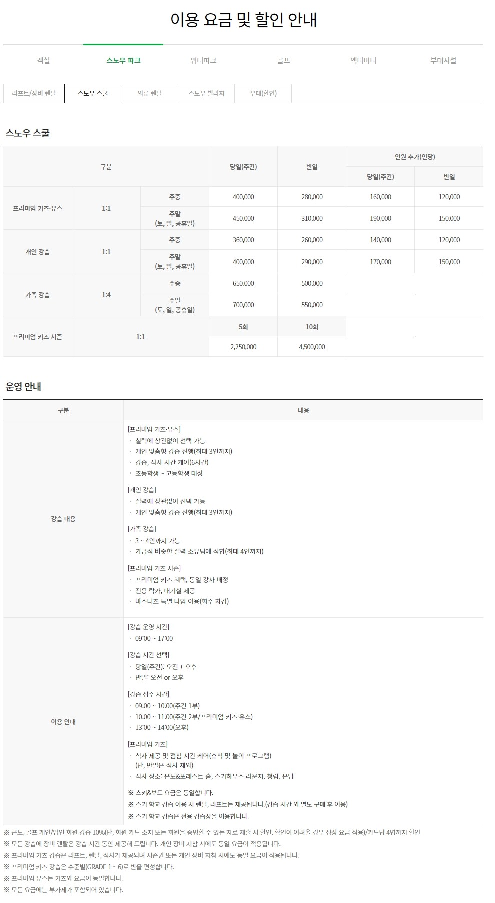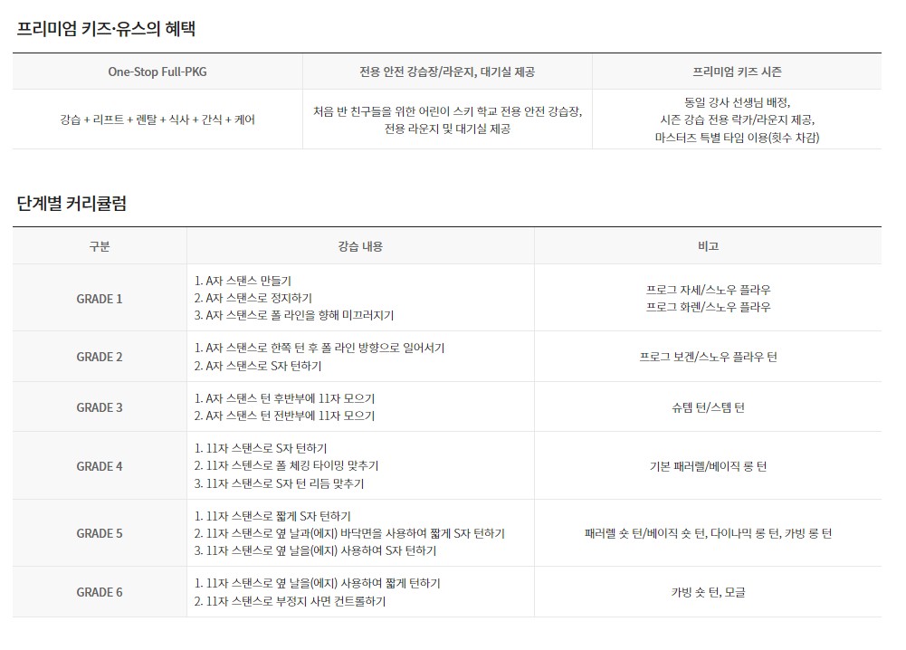| 프리미엄 키즈·유스 | 대상 2018년생~ 고등학생 강습시간 주간:4시간(오전2시간 + 점심식사 + 오후 2시간) 반일: 2시간(오전, 오후 중 택1) 이용문의 스키학교 예약실 1899-0814/ 사전예약필수 ※운영시간 :09:00~ 17:00(점심시간:12:00~ 13:00) 가격 주중 주간 400,000원 / 반일 280,000원 주말 주간 450,000원 / 반일 310,000원 |