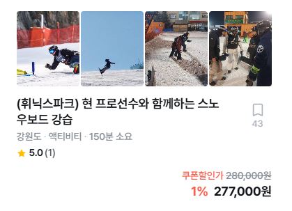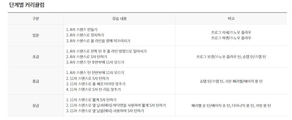| 기타강습 | 상담/문의 033-330-6391 / 010-5051-4055 일반 강습반 실력이 검증된 강사와 초보부터 상급자 까지 전문적인 강습 진행 (전문 강사/프리미엄/ 유소년/단체 강습) 전문 교육 및 선수반 국가대표 출신 감독 및 코치진, 다수의 데몬 등 국내 최고의 지도자가 스노보드 종목별 전문 교육부터 선수 훈련 대회 참가까지 체계적인 강습 진행 |