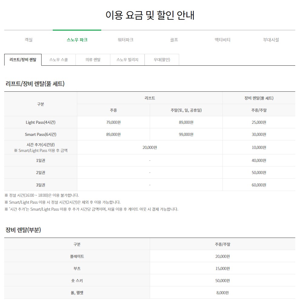 | 개인·가족 강습 | 대상 2018년생~ 성인 강습시간 주간:4시간(오전2시간+ 오후 2시간) 반일:2시간 (오전, 오후 중 택1) 이용문의 스키학교 예약실 1899-0814/ 사전예약필수 ※운영시간 :09:00~ 17:00(점심시간:12:00~ 13:00) 가격 주중 주간 360,000원 / 반일 260,000원 주말 주간 400,000원 / 반일 290,000원 |